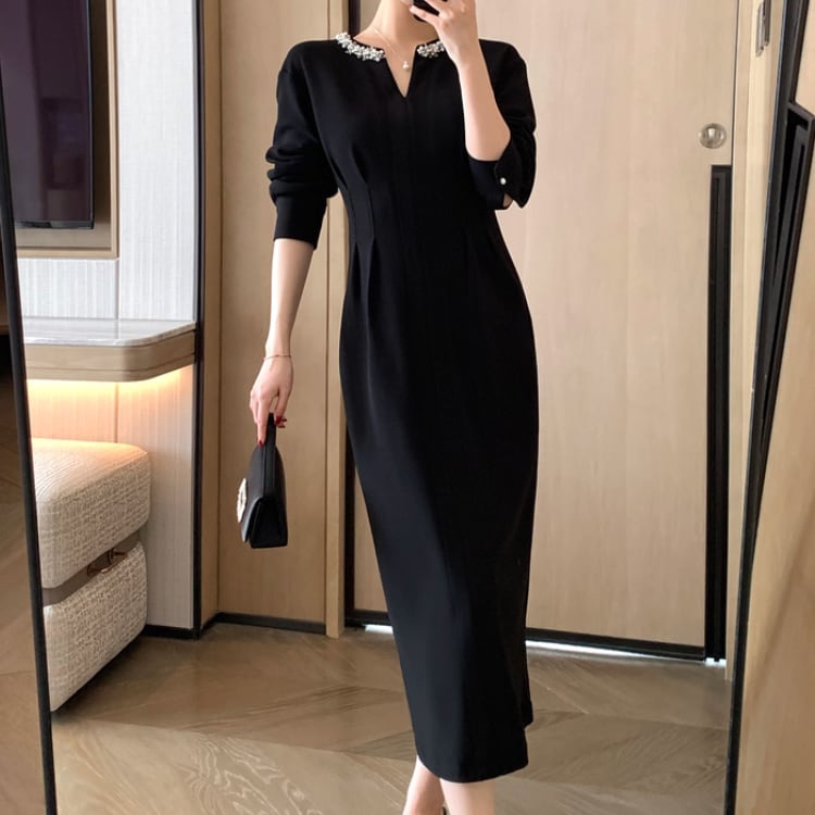 韓国風通勤 細見え&半ハイネック長袖ドレス YH9458