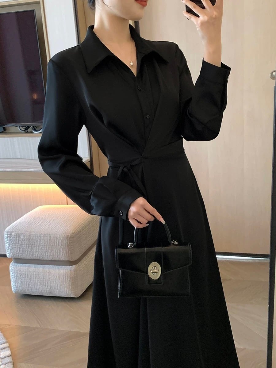 ブラックシャツワンピース ウエストマーク ロングスカート YH8877