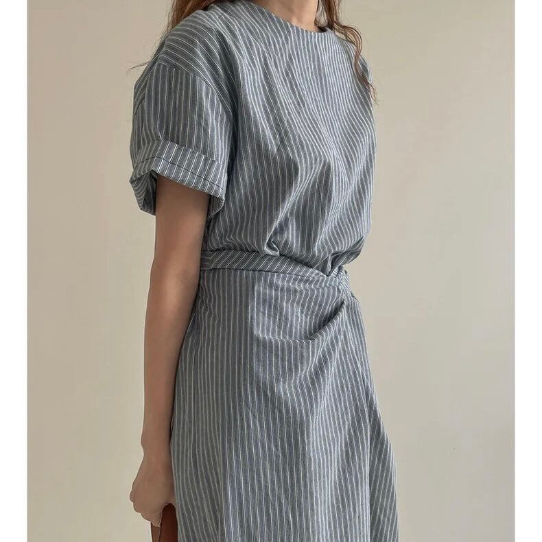 ストライプ切り替えウエストリボン半袖ワンピース YH8905