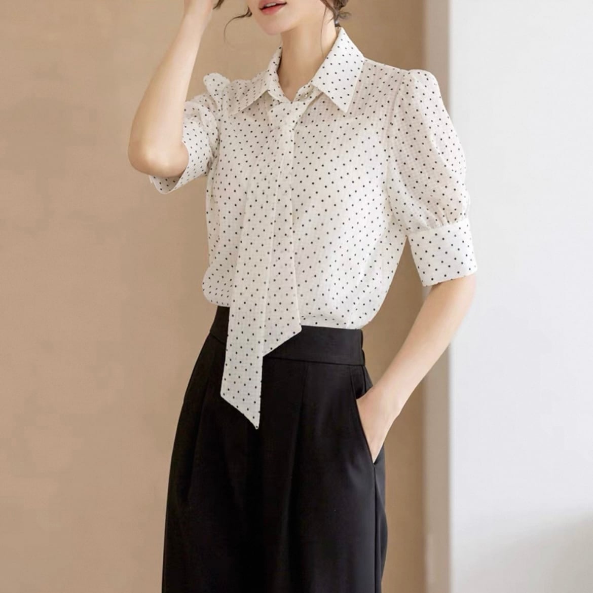 爽やかな水玉模様にリボンラペルが知的な印象を与える通勤シャツです。