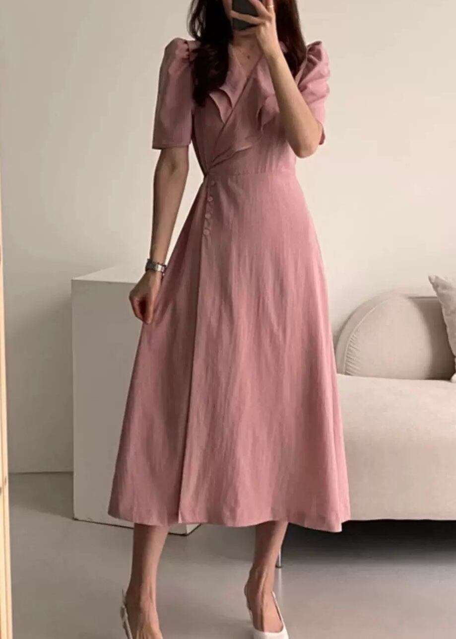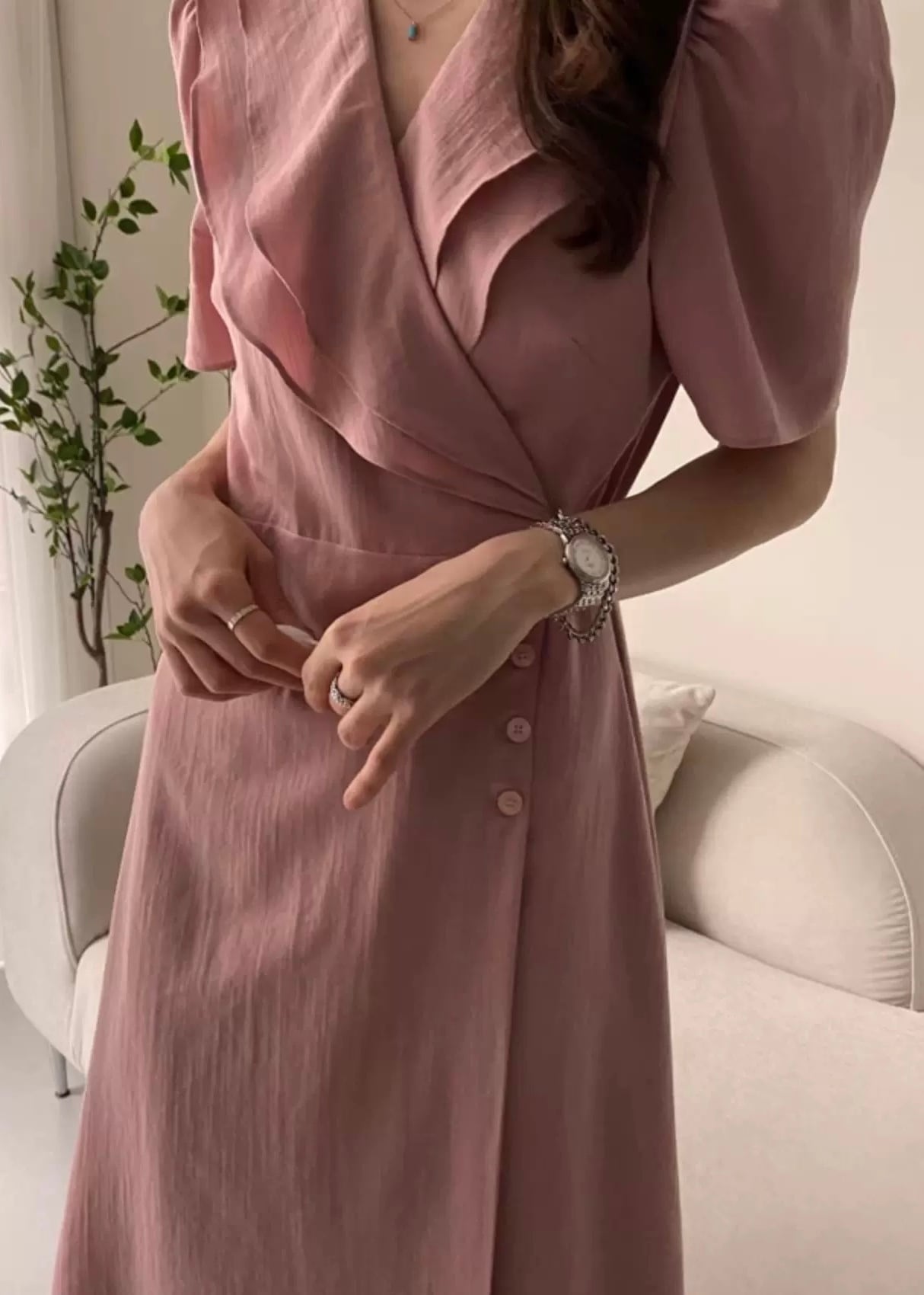 深めのVネックとウエストラインが女性らしさを引き立て、スッキリとした美シルエットを演出します。