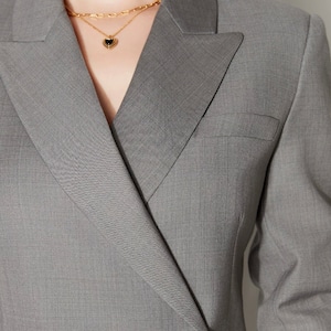 落ち着いた色味とクラシックなダブルボタンで、大人の上品さを引き立てます。