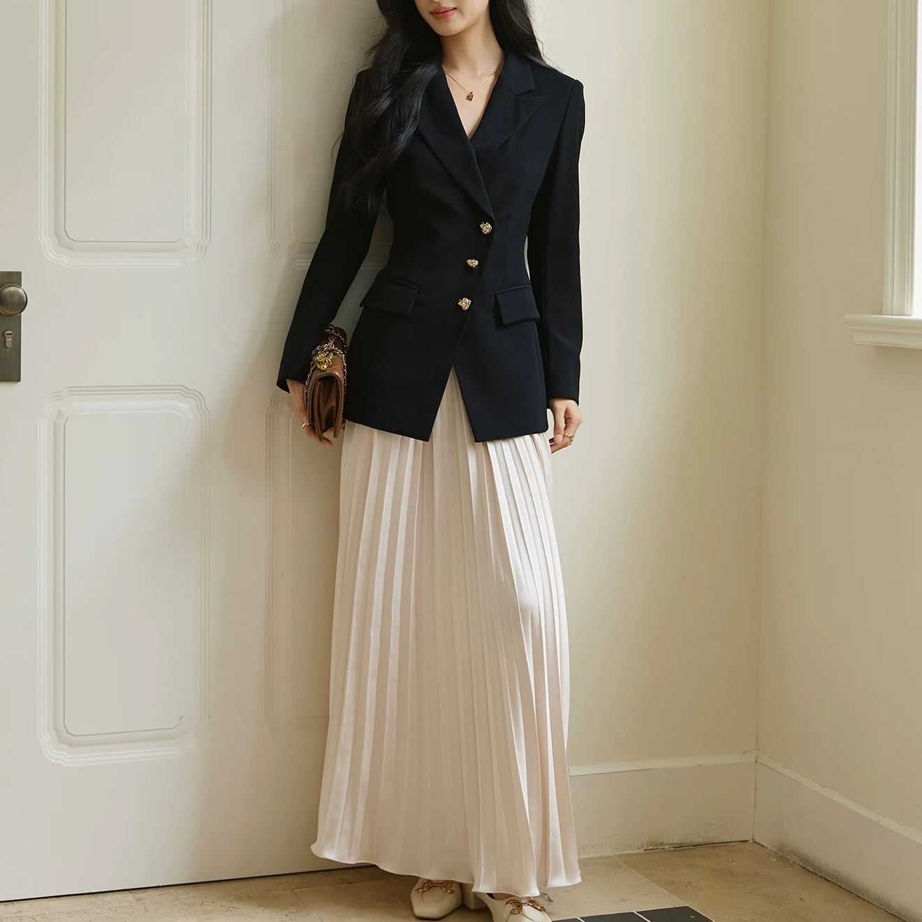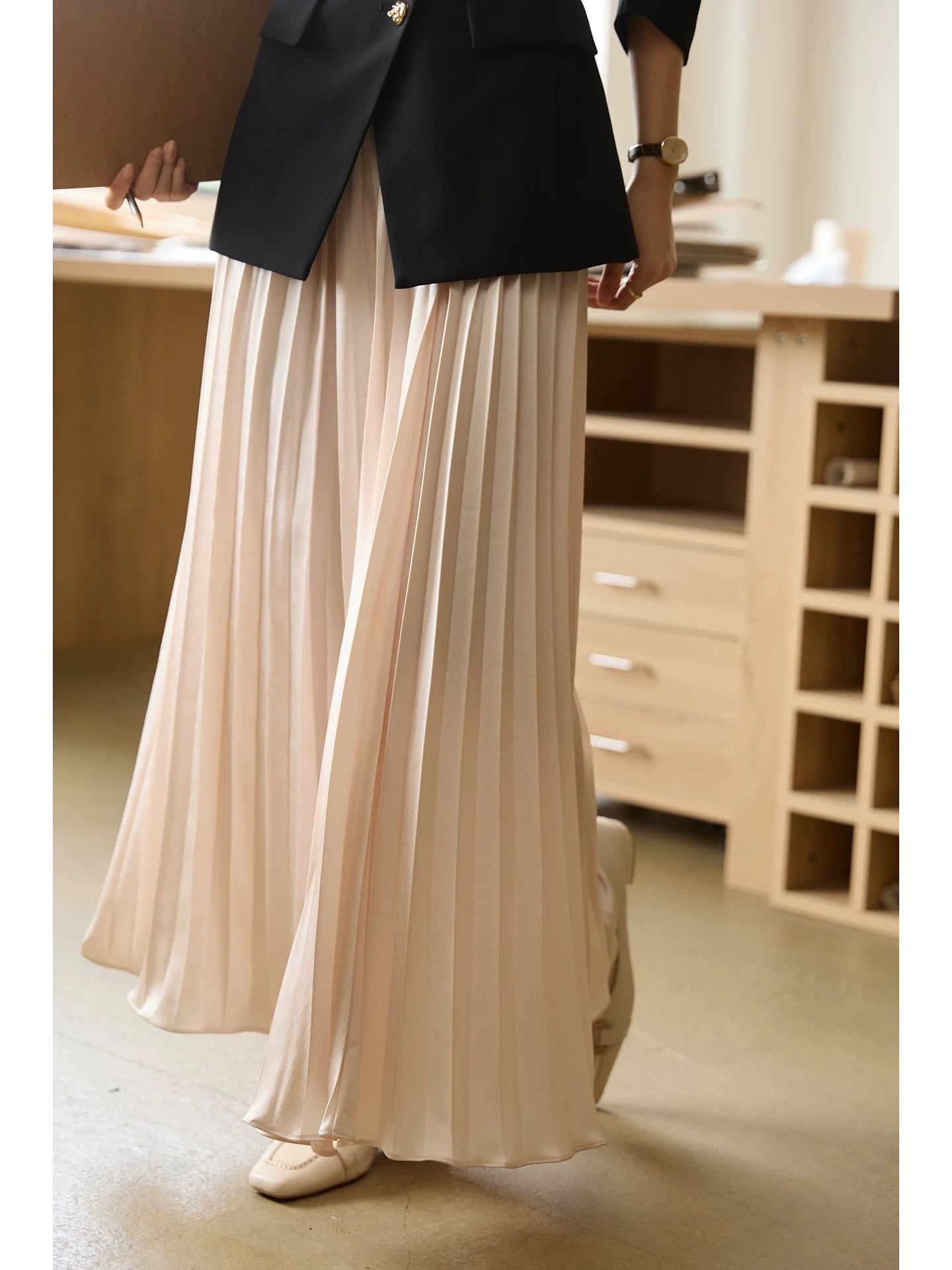 美脚効果 垂れ感 Aライン プリーツ ロングスカート YH9399