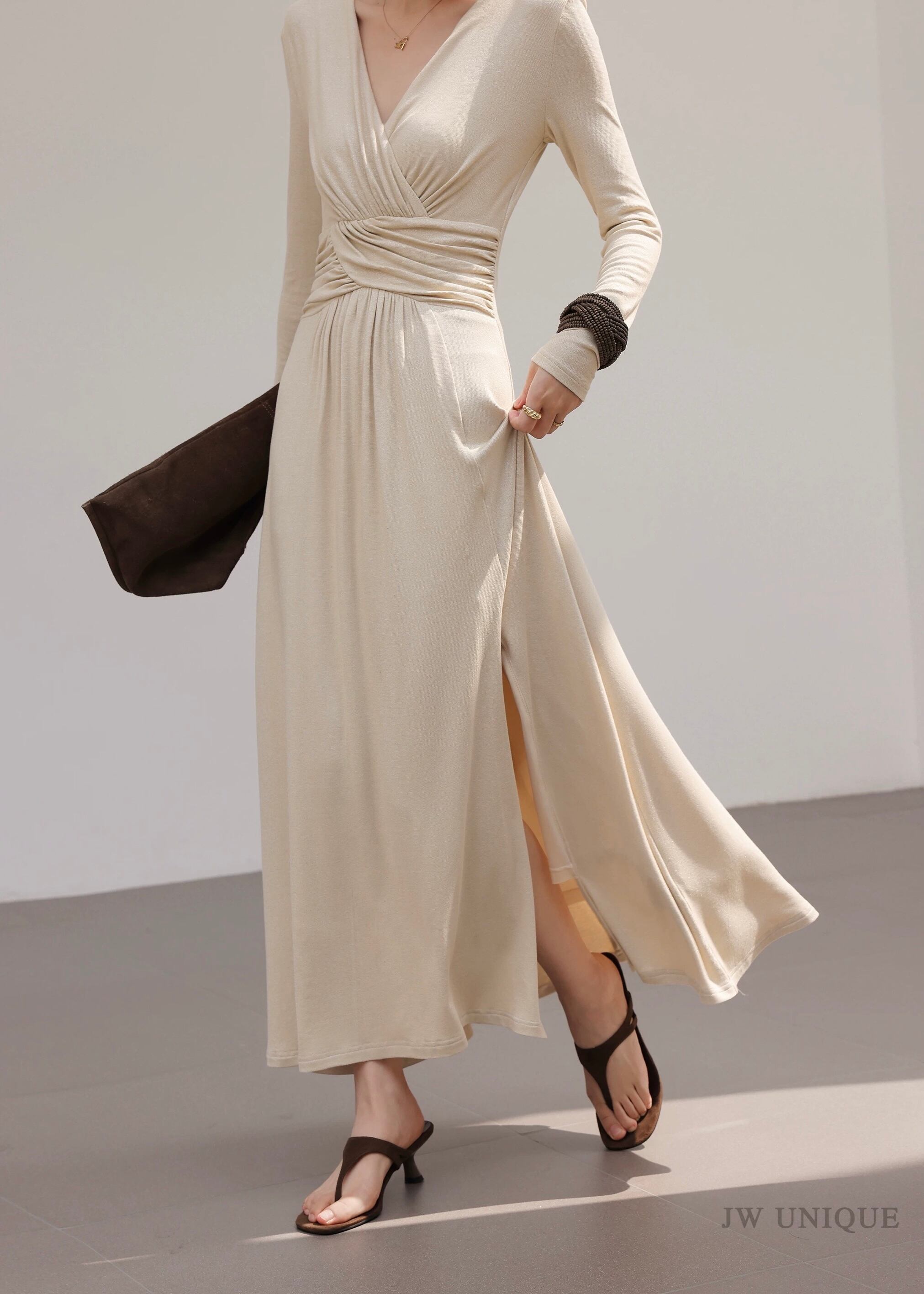 体のラインを美しく見せるギャザーデザインと、歩くたびに揺れる優雅なシルエット。