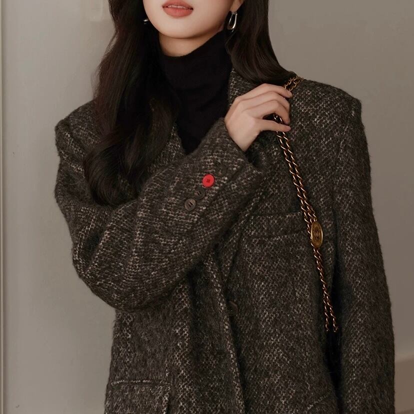 ノッチドラペルが特徴的な、ヒップ丈のオーバーサイズジャケットです。