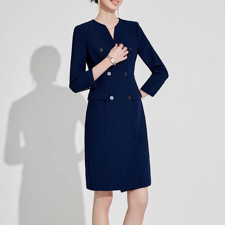 ダブルブレストのデザインが目を引くミモレ丈ワンピース。