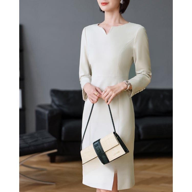 Vネック ミモレ丈 スリット ワンピース ◆2col YH9779