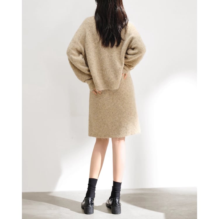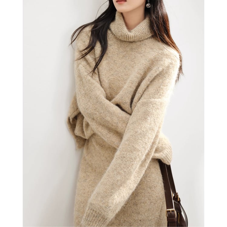 暖かく柔らかなニット素材を使用した、タートルネックのトップスとスカートの2点セット。