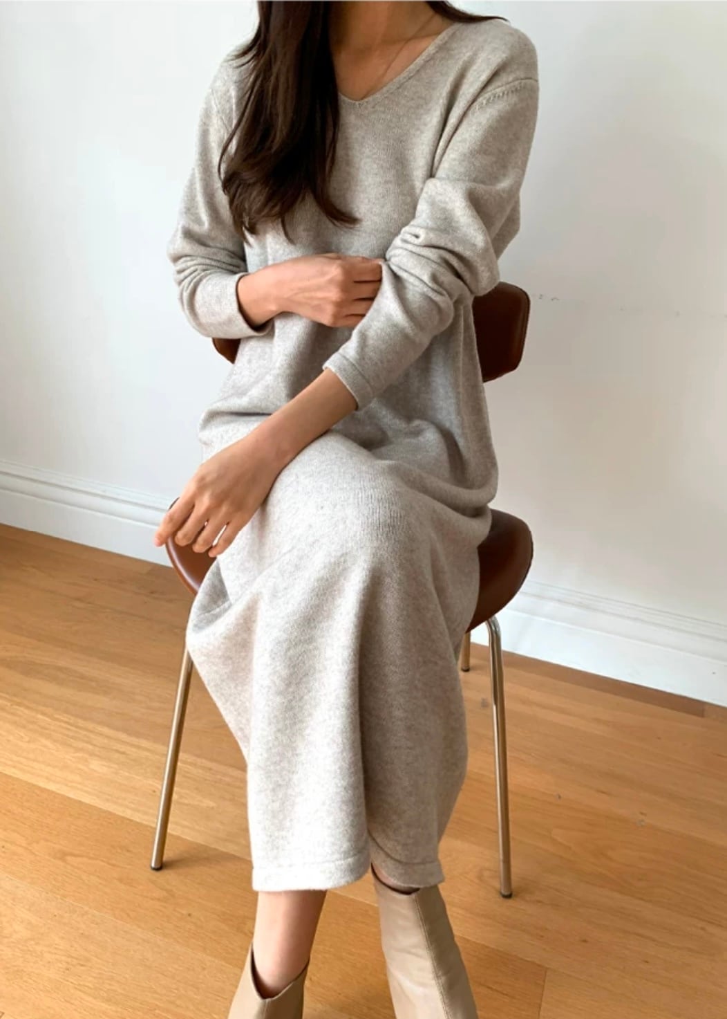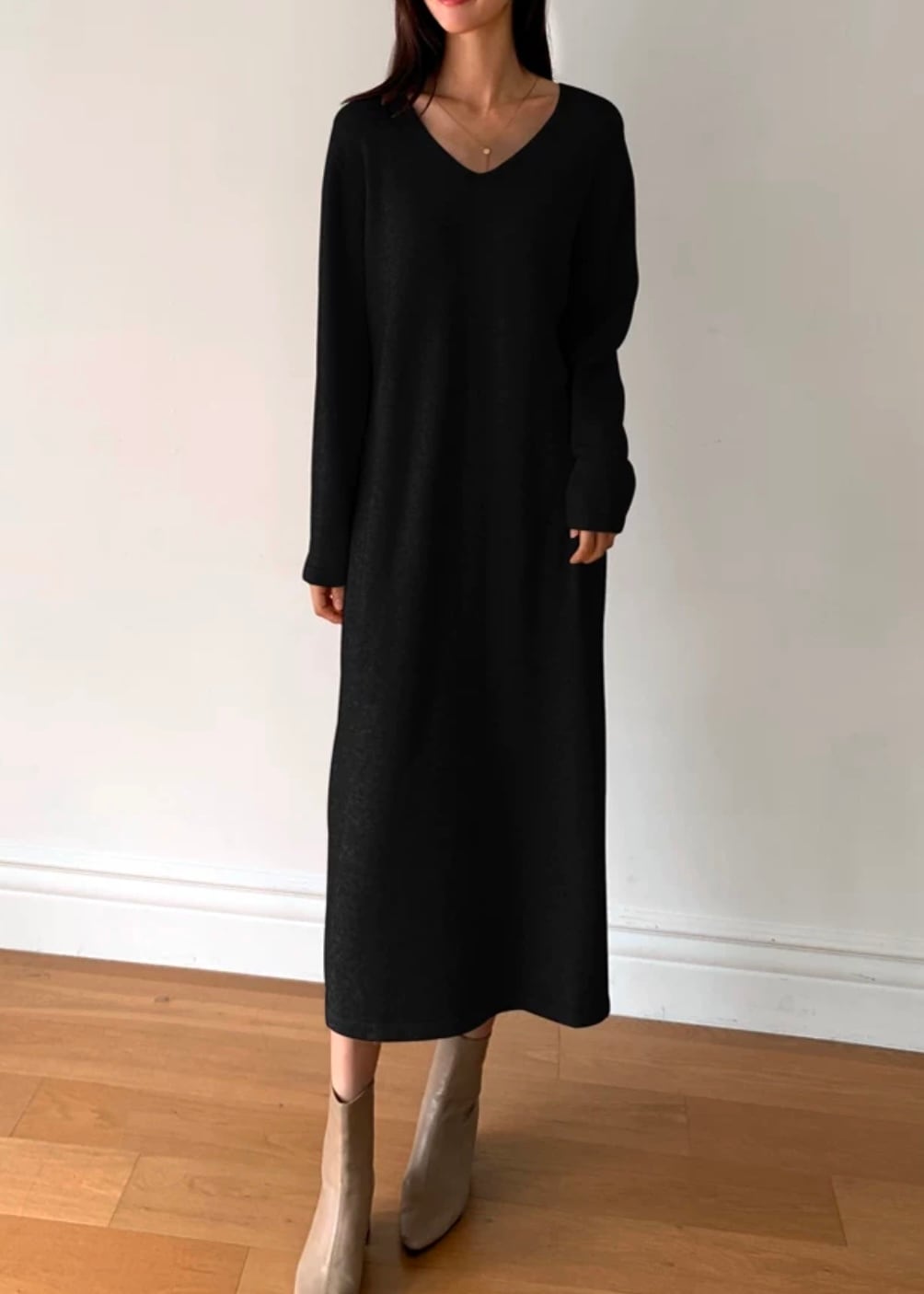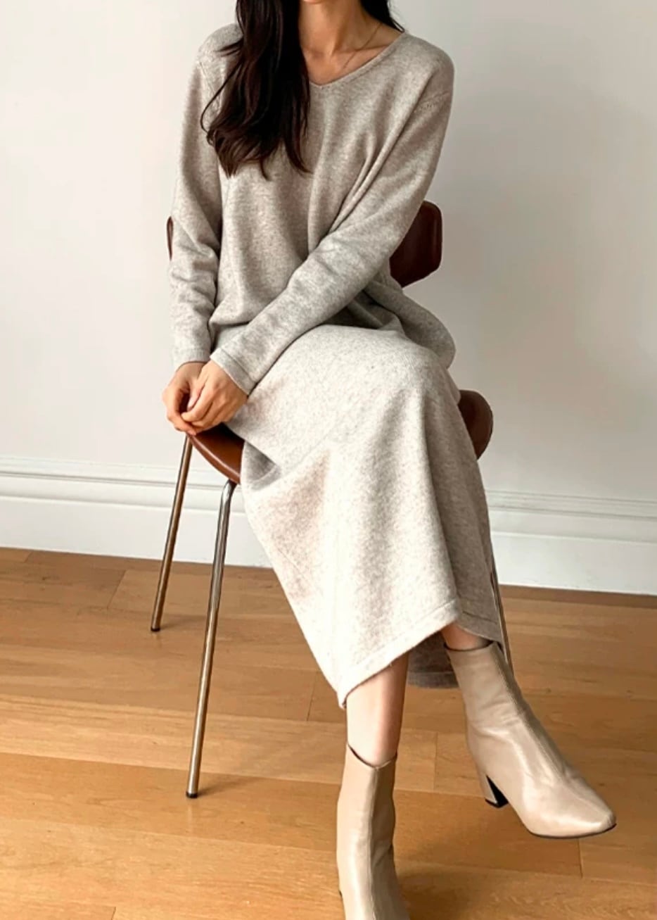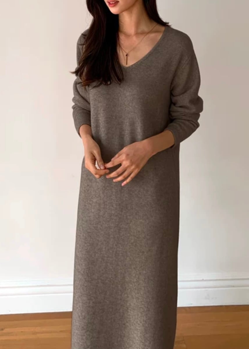 深めのVネックがデコルテを美しく見せてくれる長袖ワンピース。