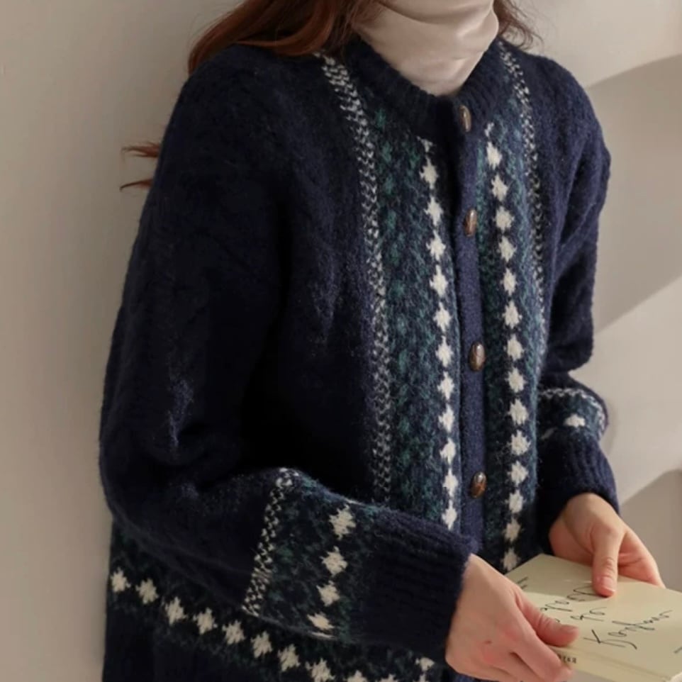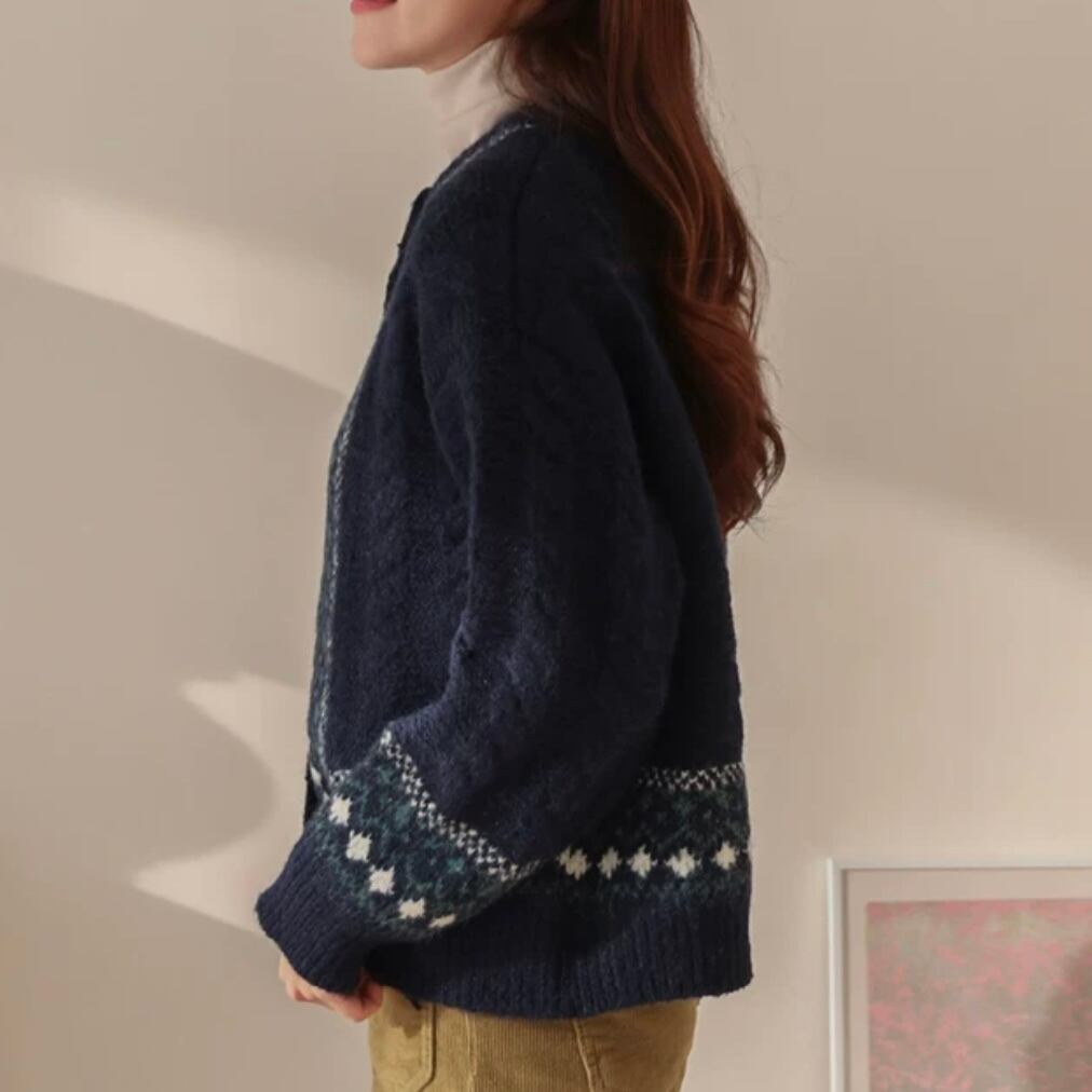 柄編みが目を引く、クルーネックの長袖ニットカーディガンです。