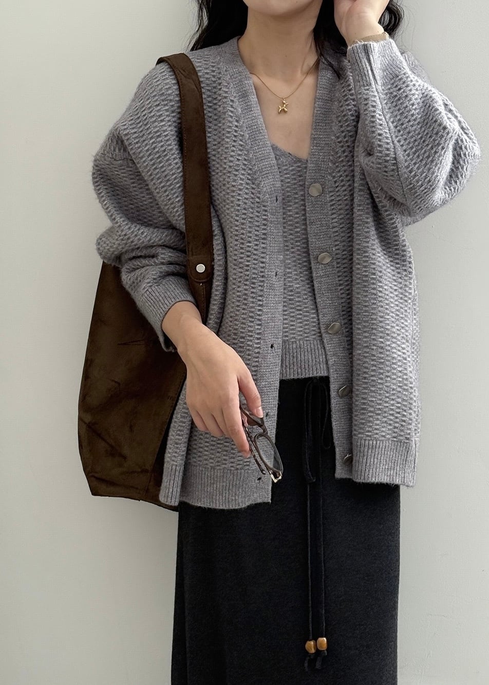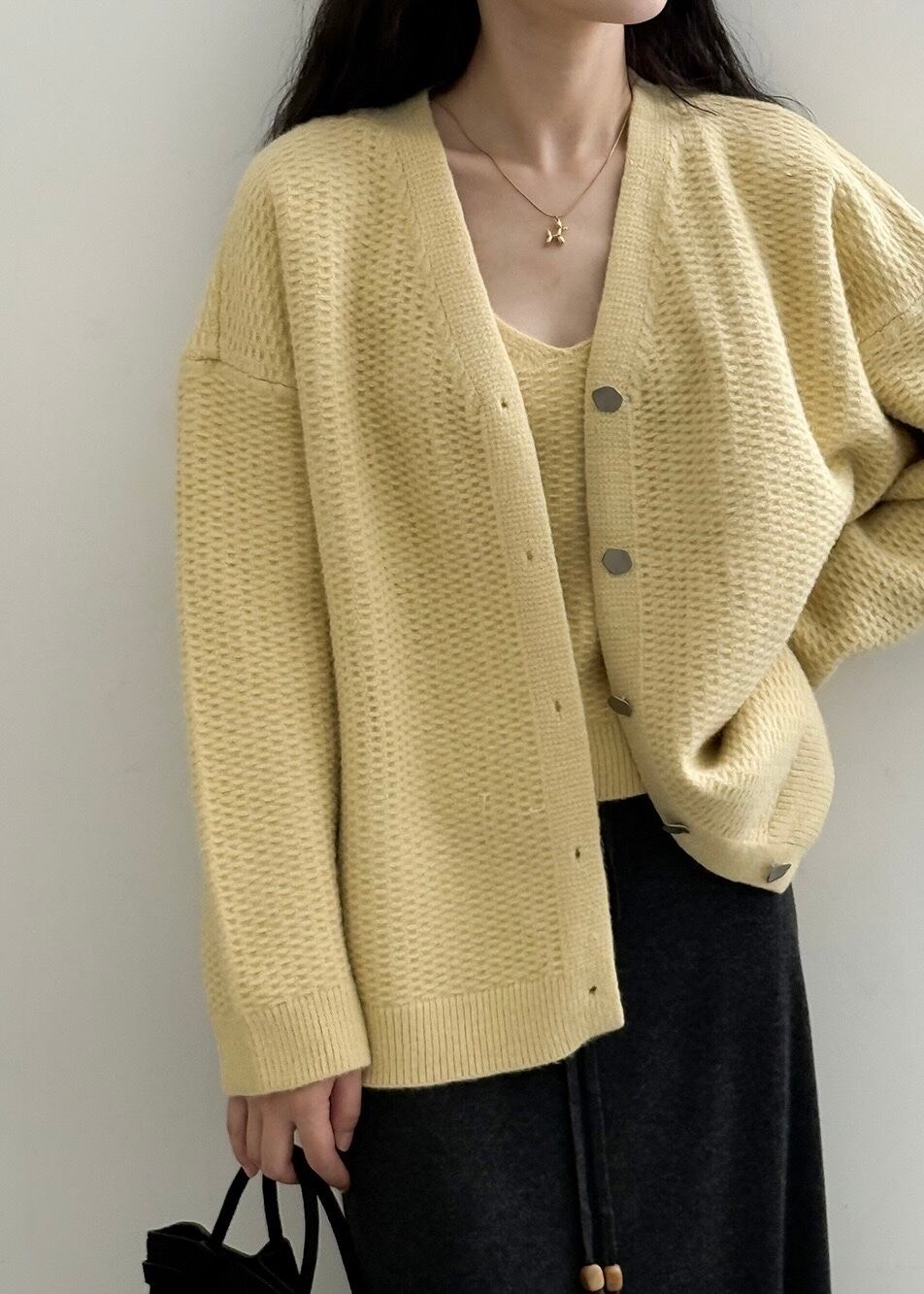 カーディガンとタンクトップがセットになっていて、そのまま着るだけでスタイルが完成。