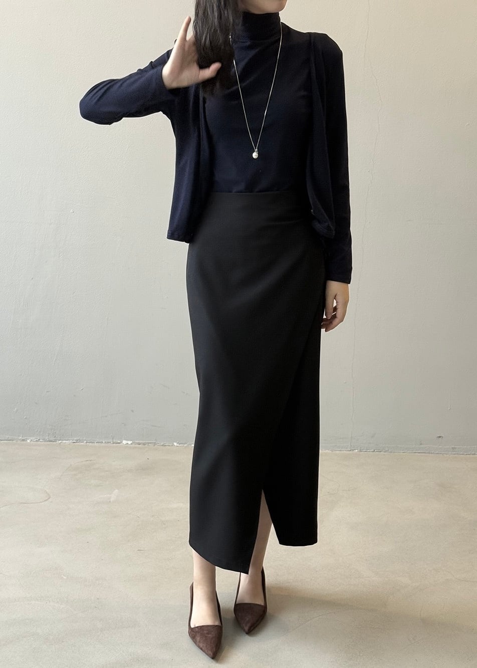 アシンメトリーなシルエットとスリットが、洗練された印象を与えます。