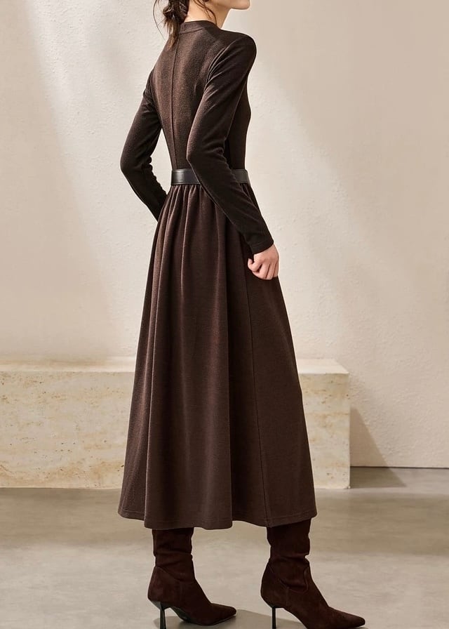 深みのあるVネックとAラインシルエットが、上品な印象を与えるワンピース。