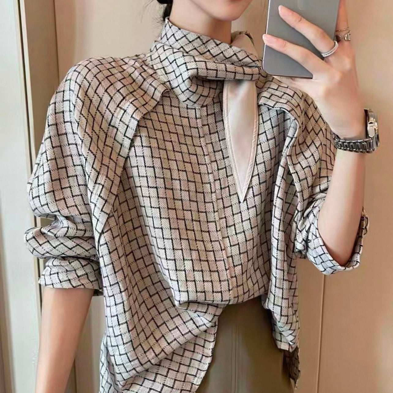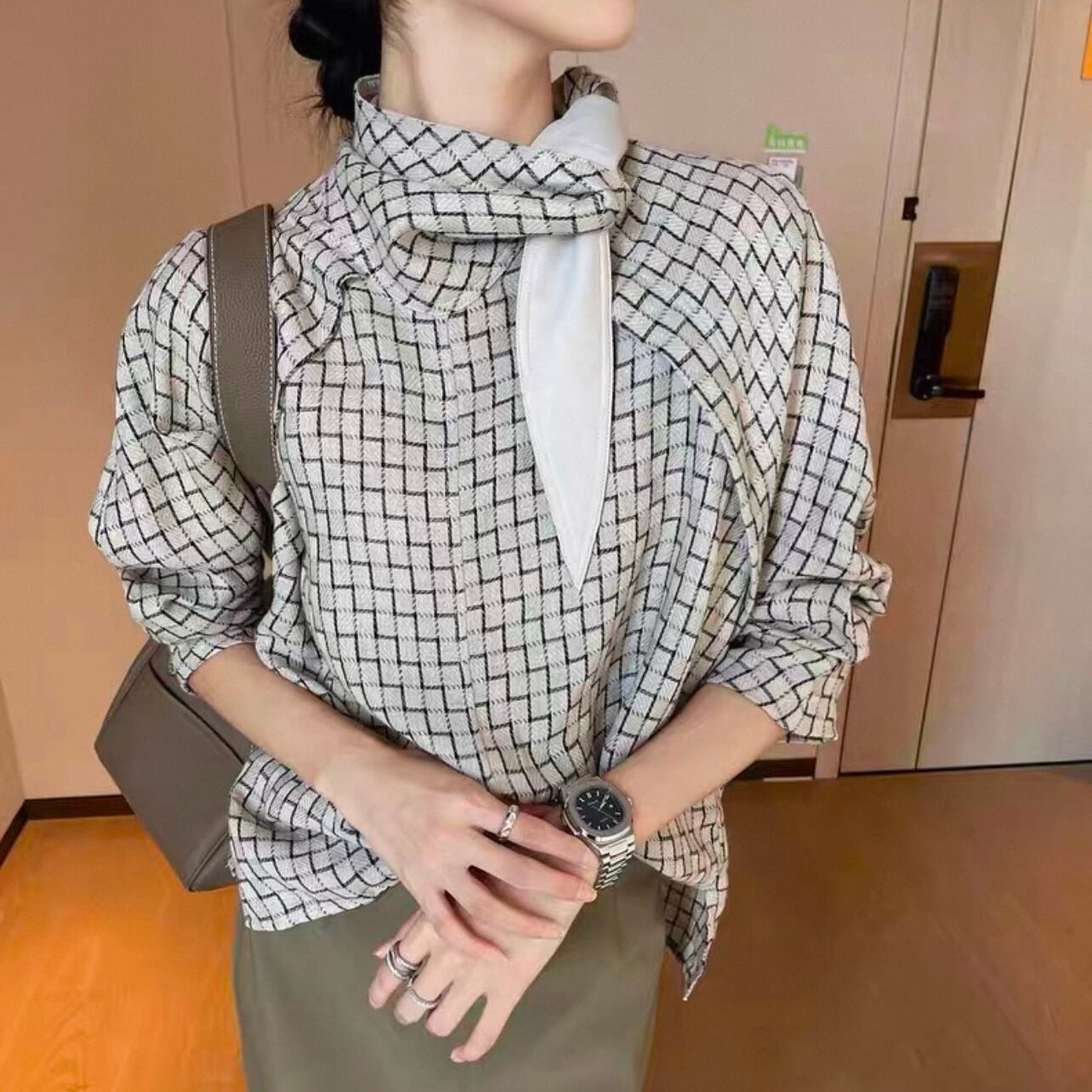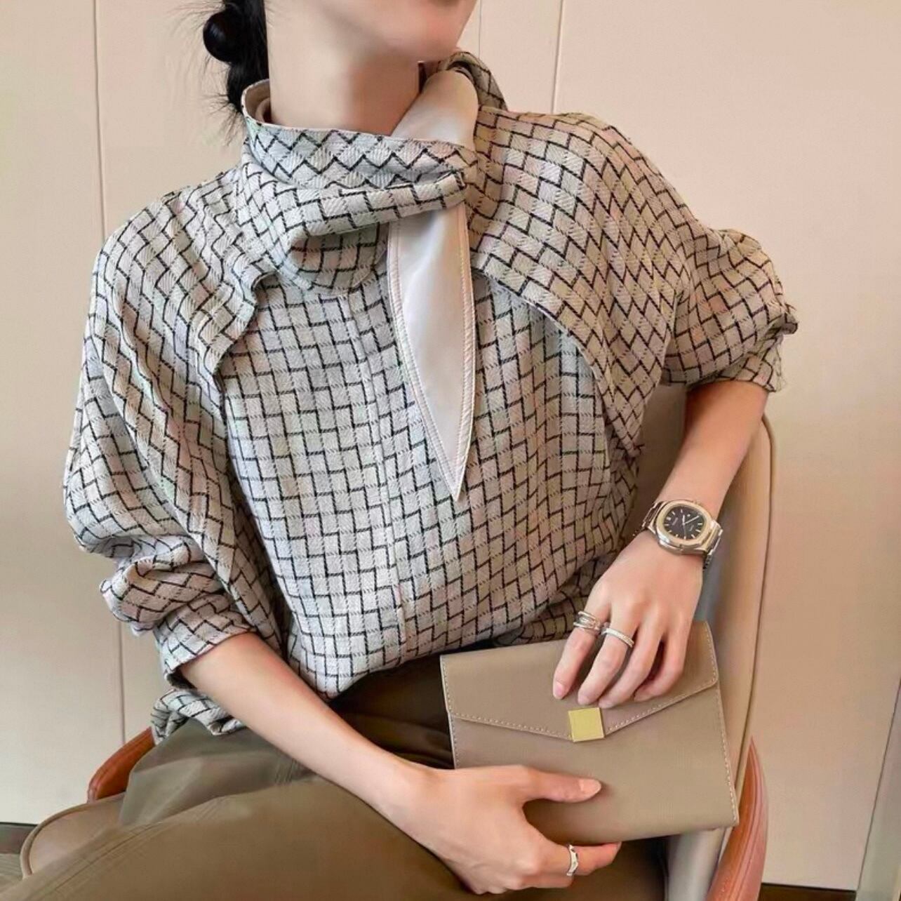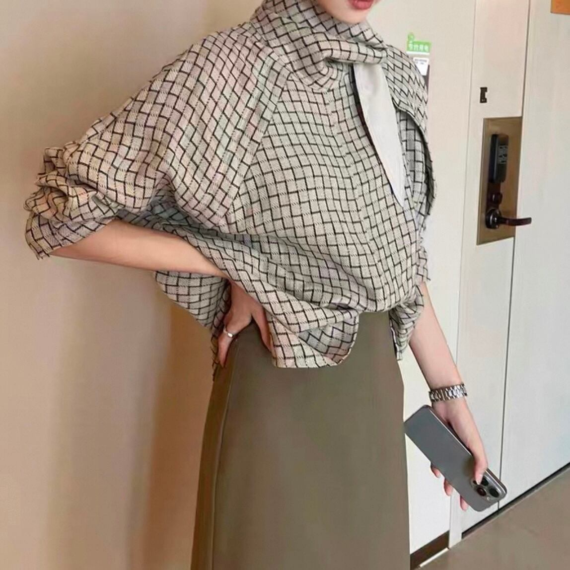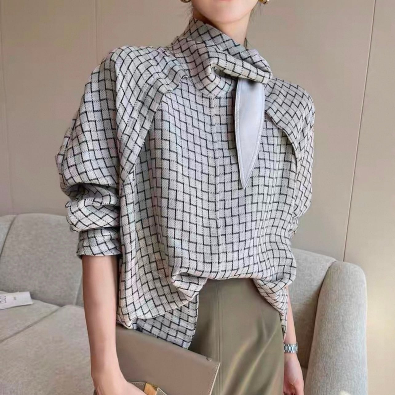 ボウタイがアクセントになった長袖シャツブラウス。