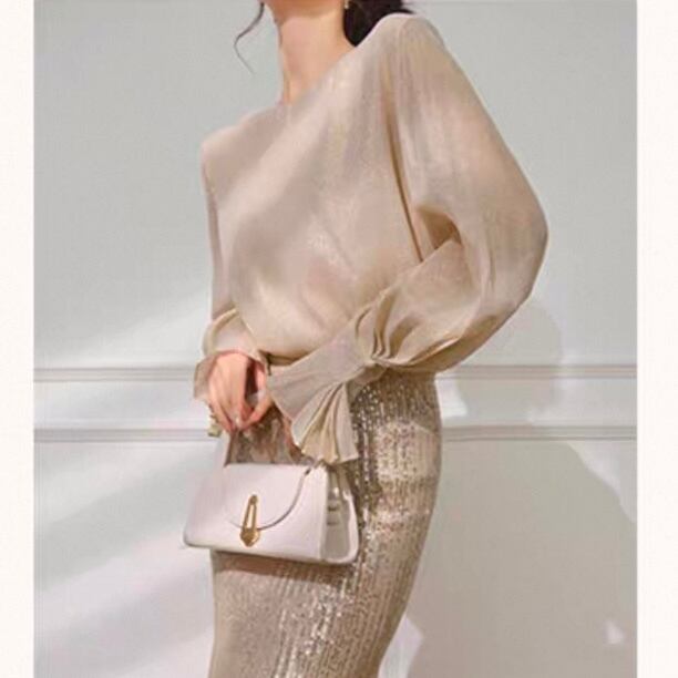 袖口のギャザーが上品な印象を与える長袖ブラウスです。
