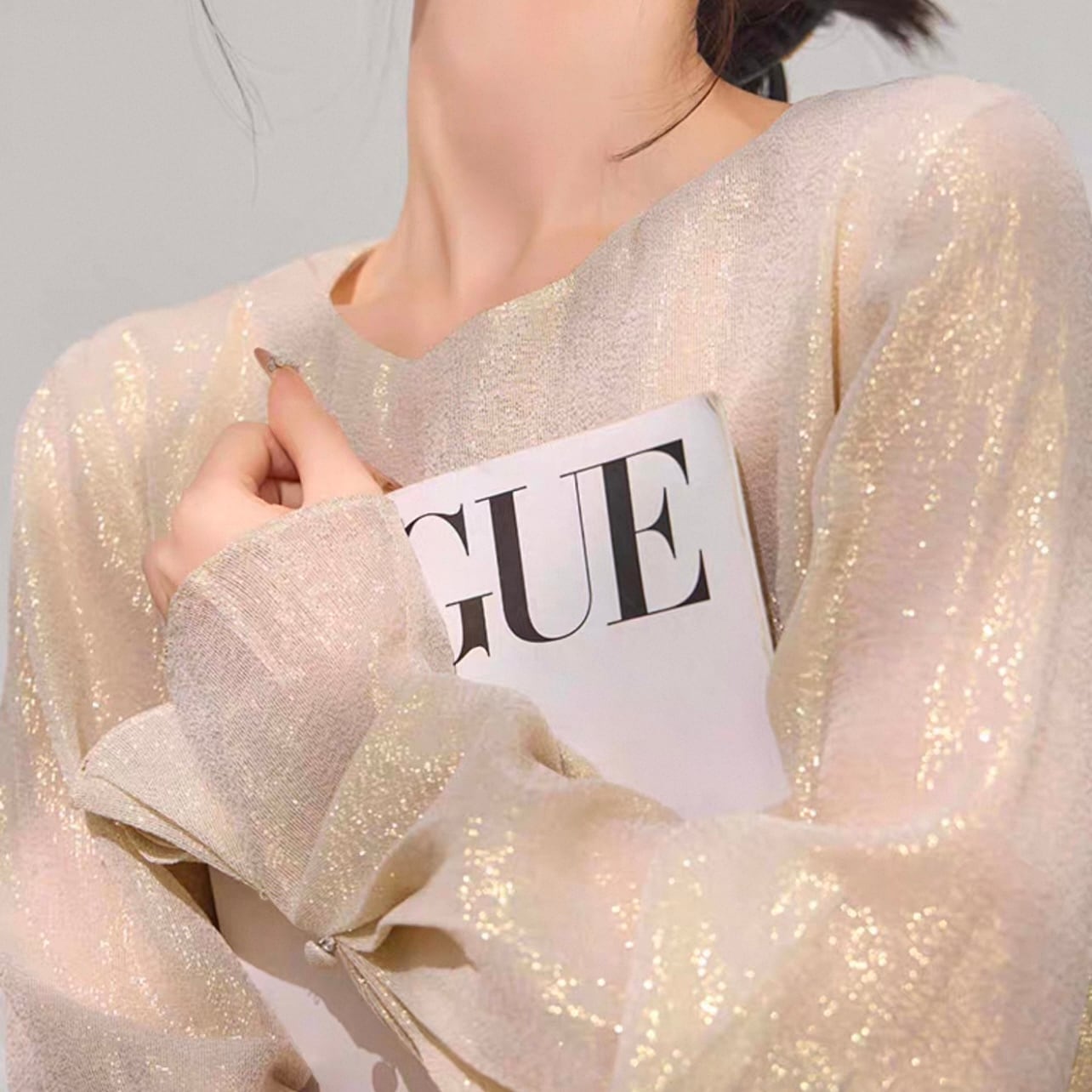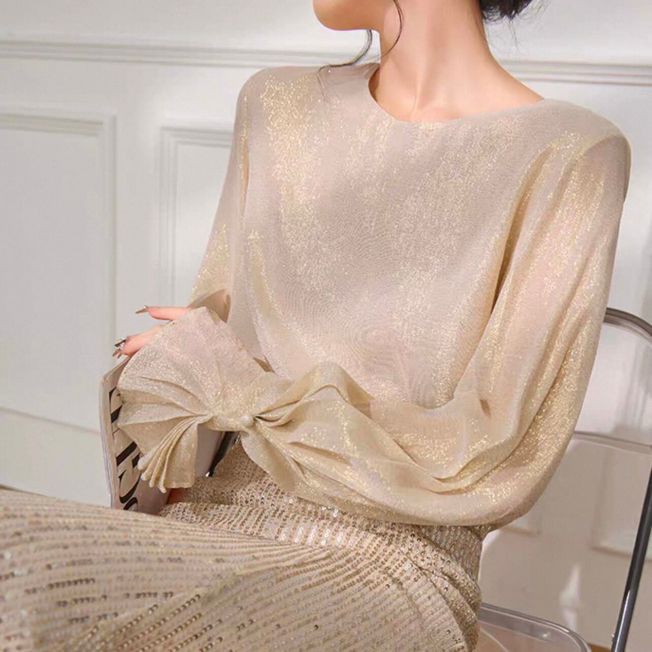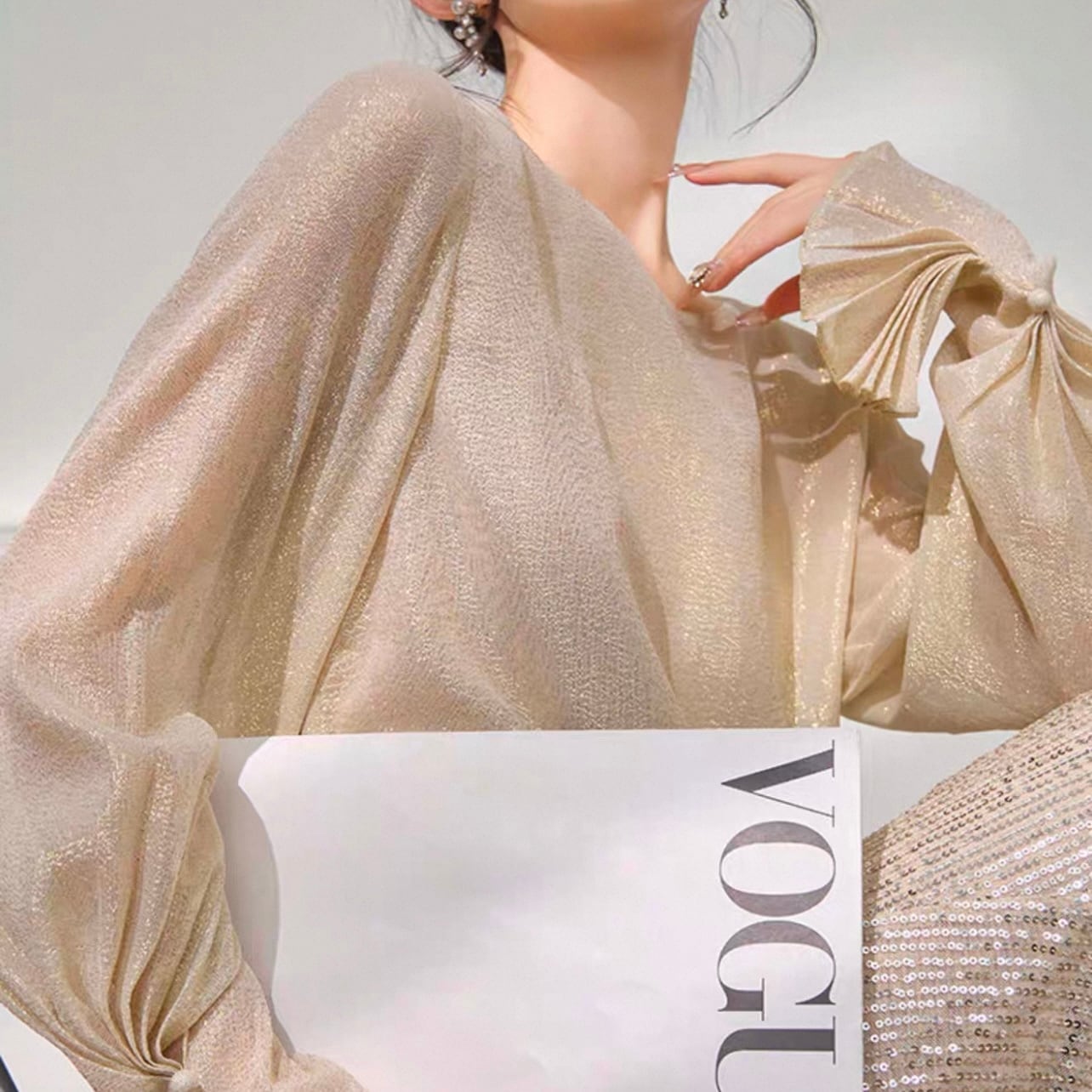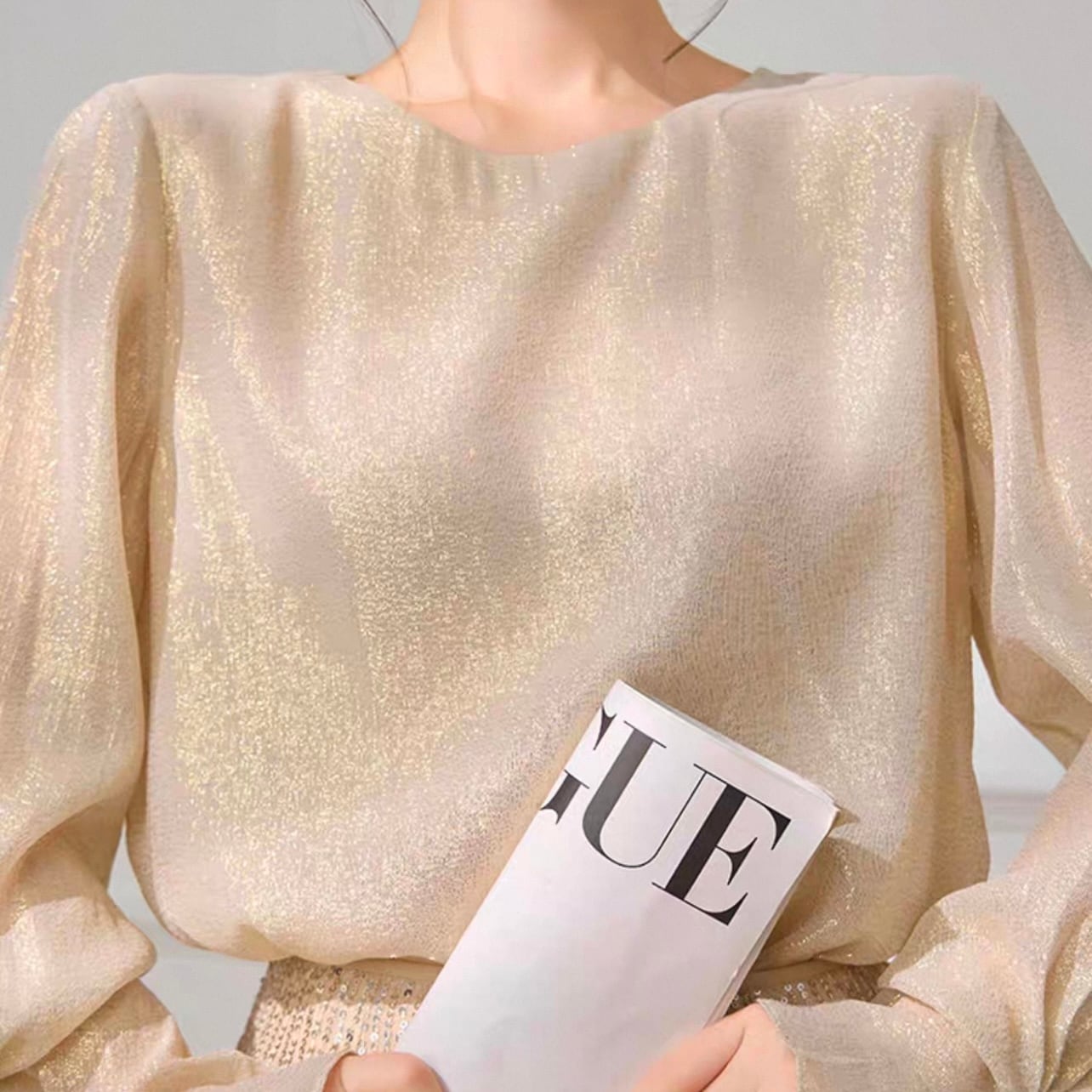 袖口ギャザー ラウンドネック ブラウス YH9925