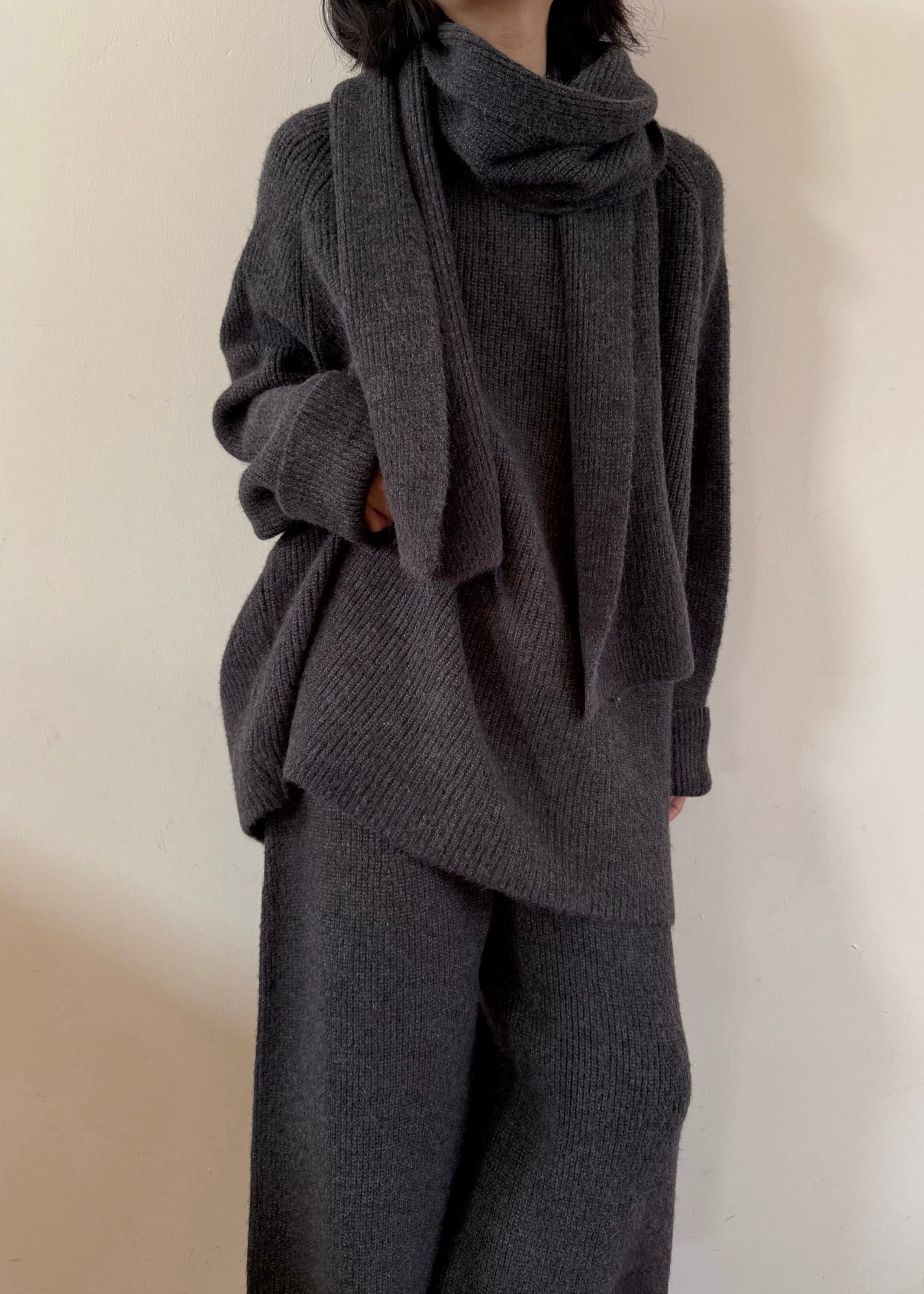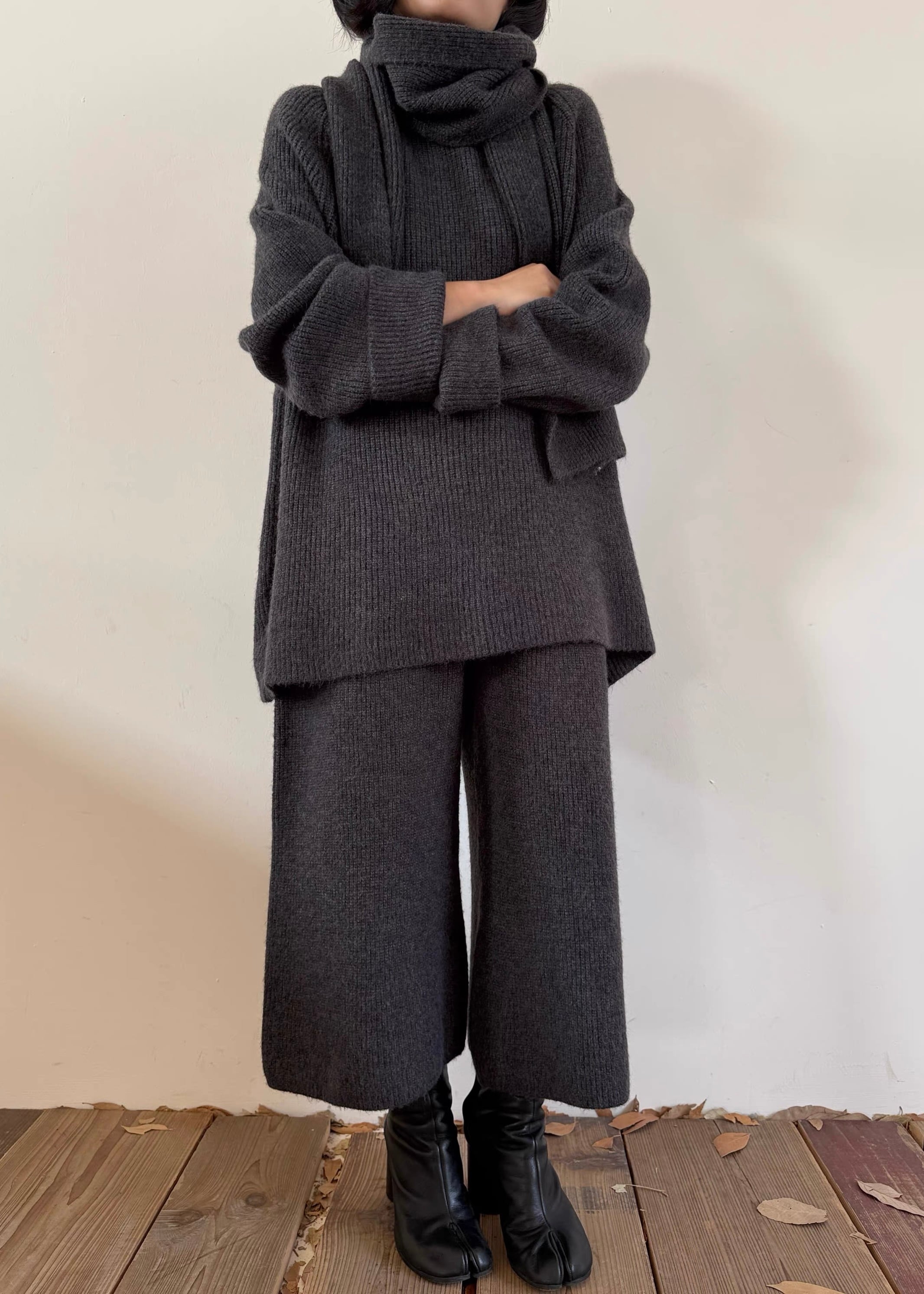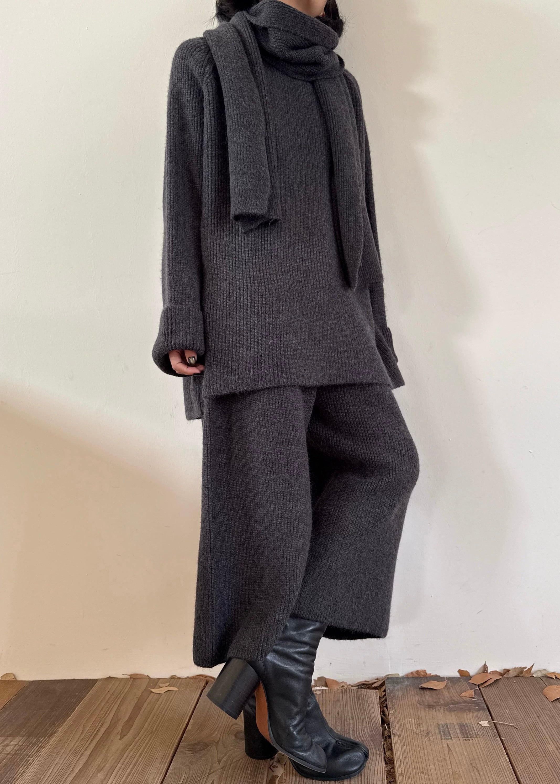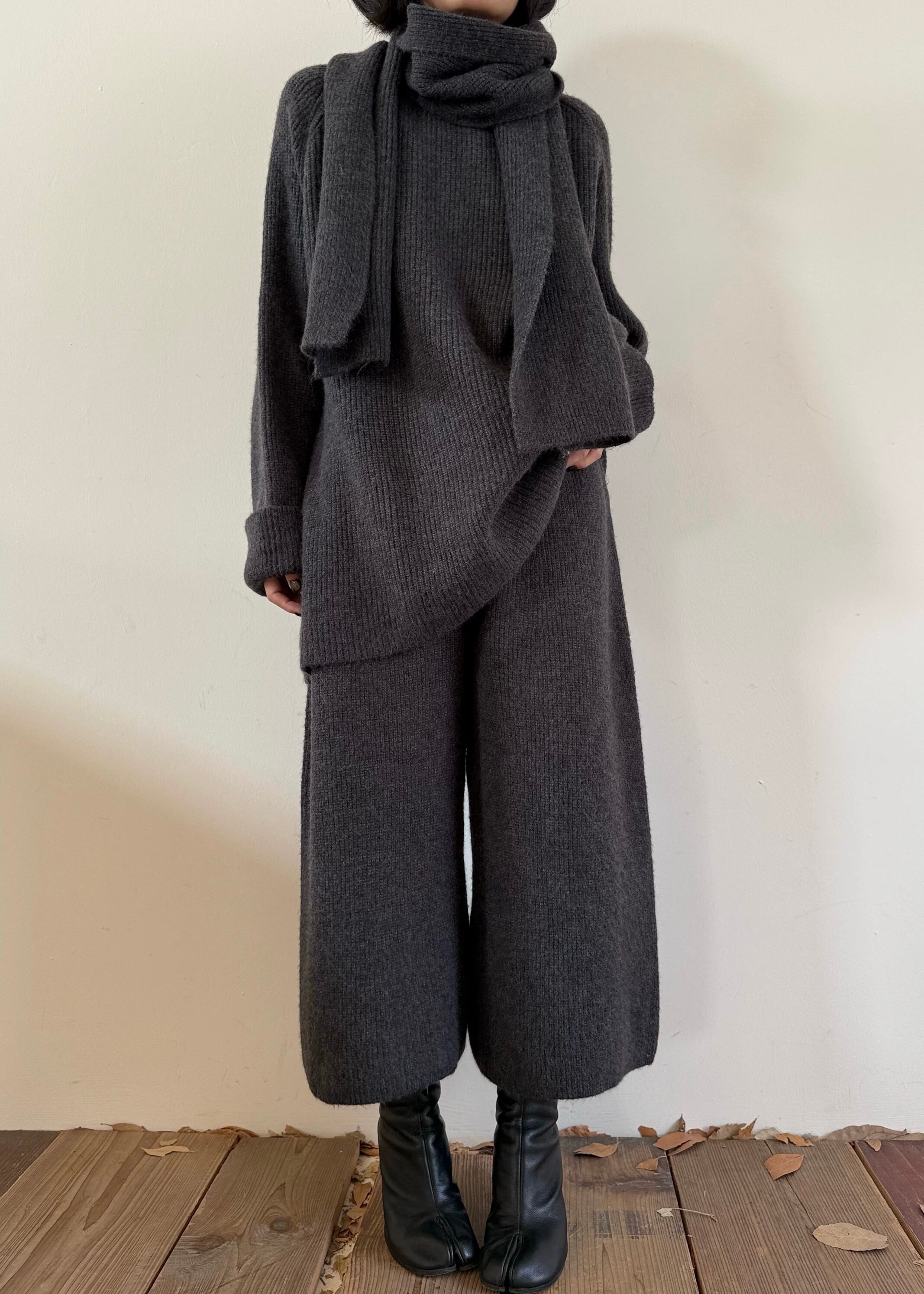 表情のあるニット素材を使用した、落ち着いた印象のセットアップ。