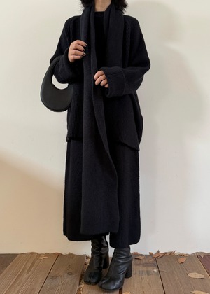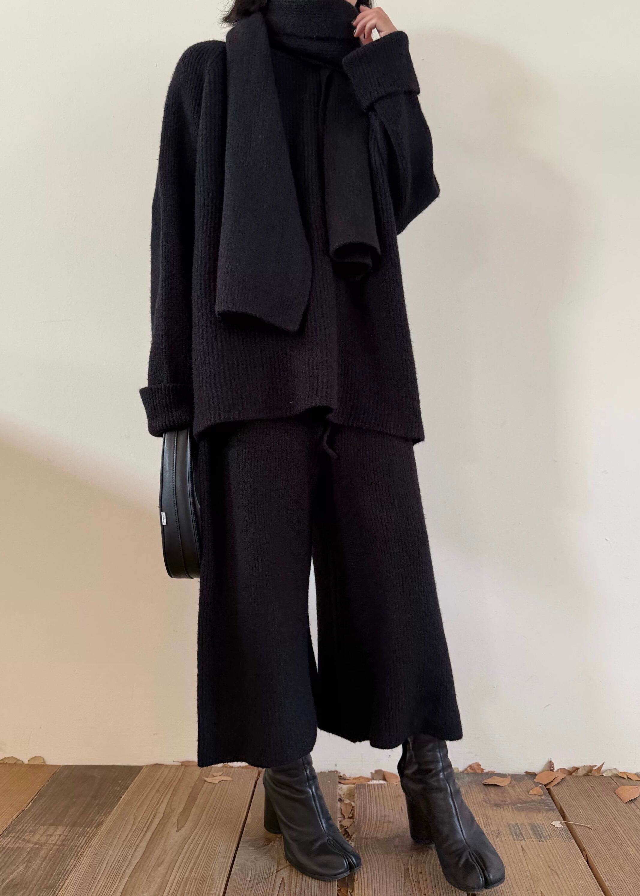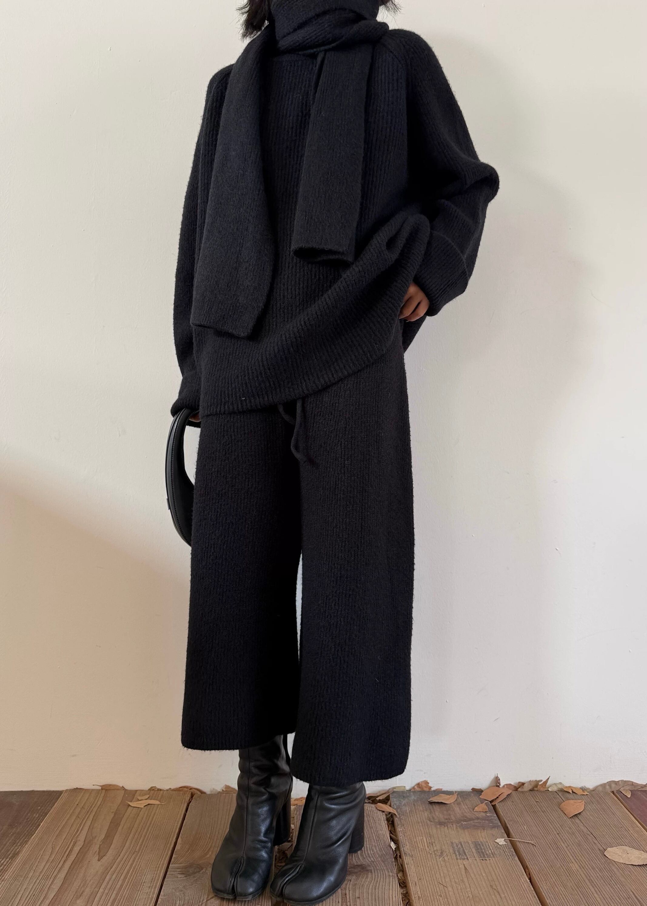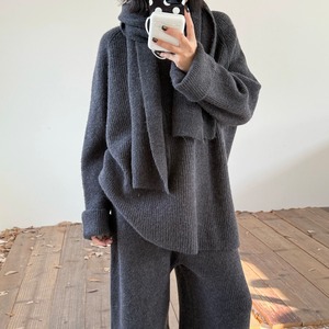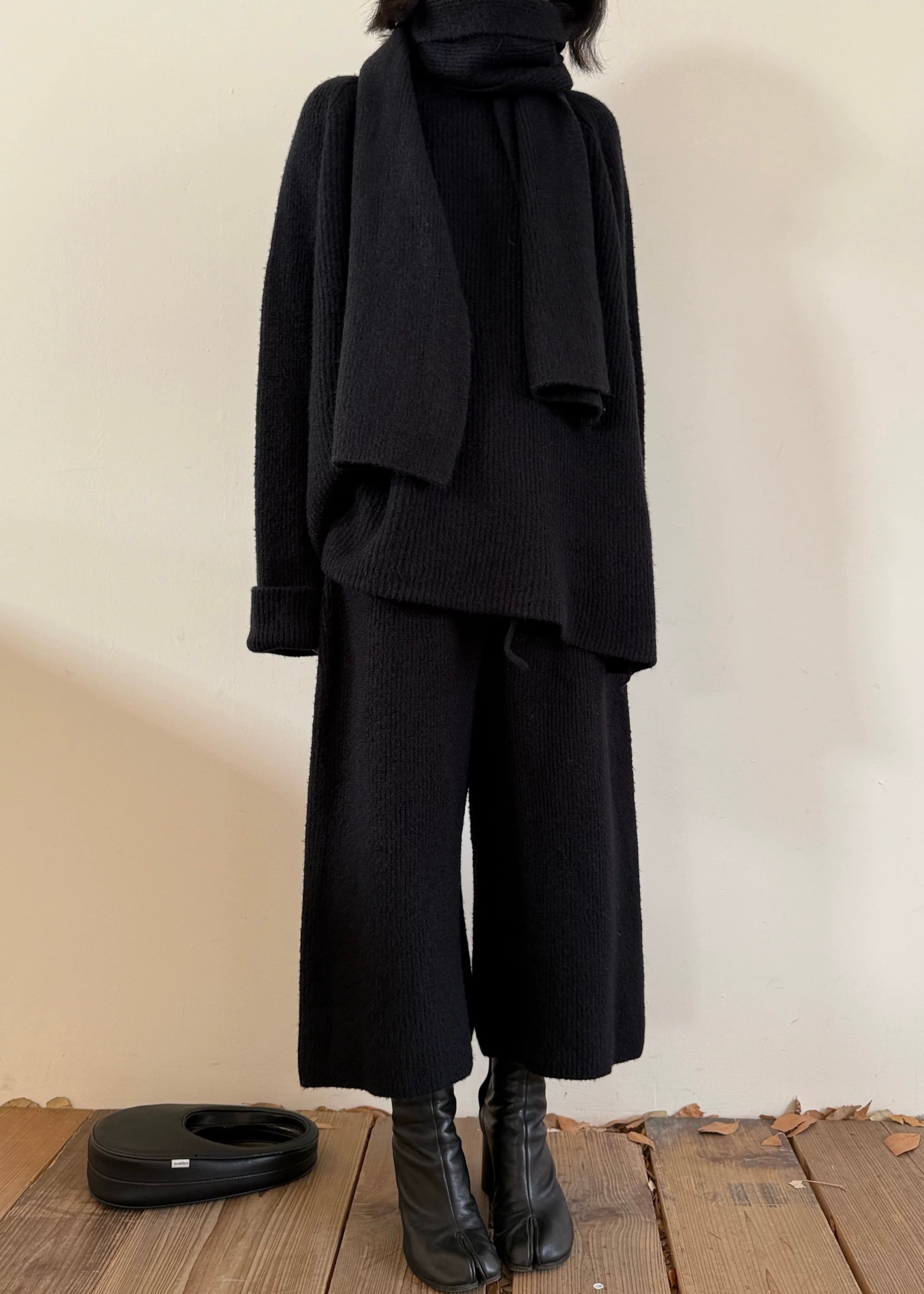 表情のあるニット素材を使用した、落ち着いた印象のセットアップ。