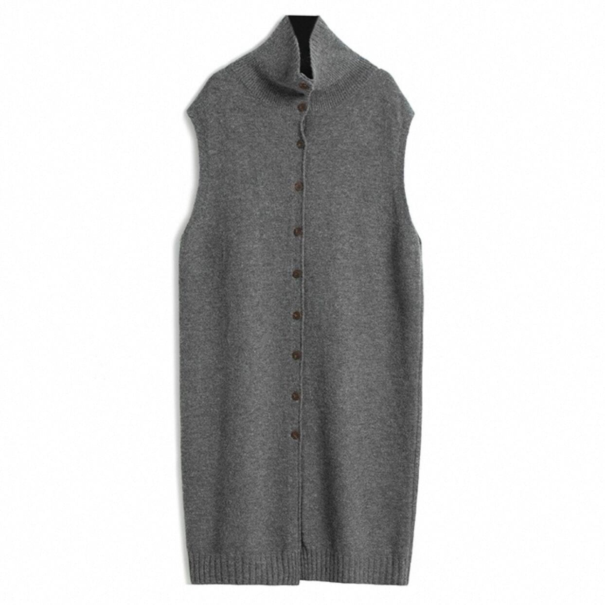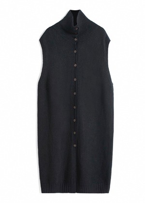 すっきりとしたハイネックデザインのロング丈ニットベスト。