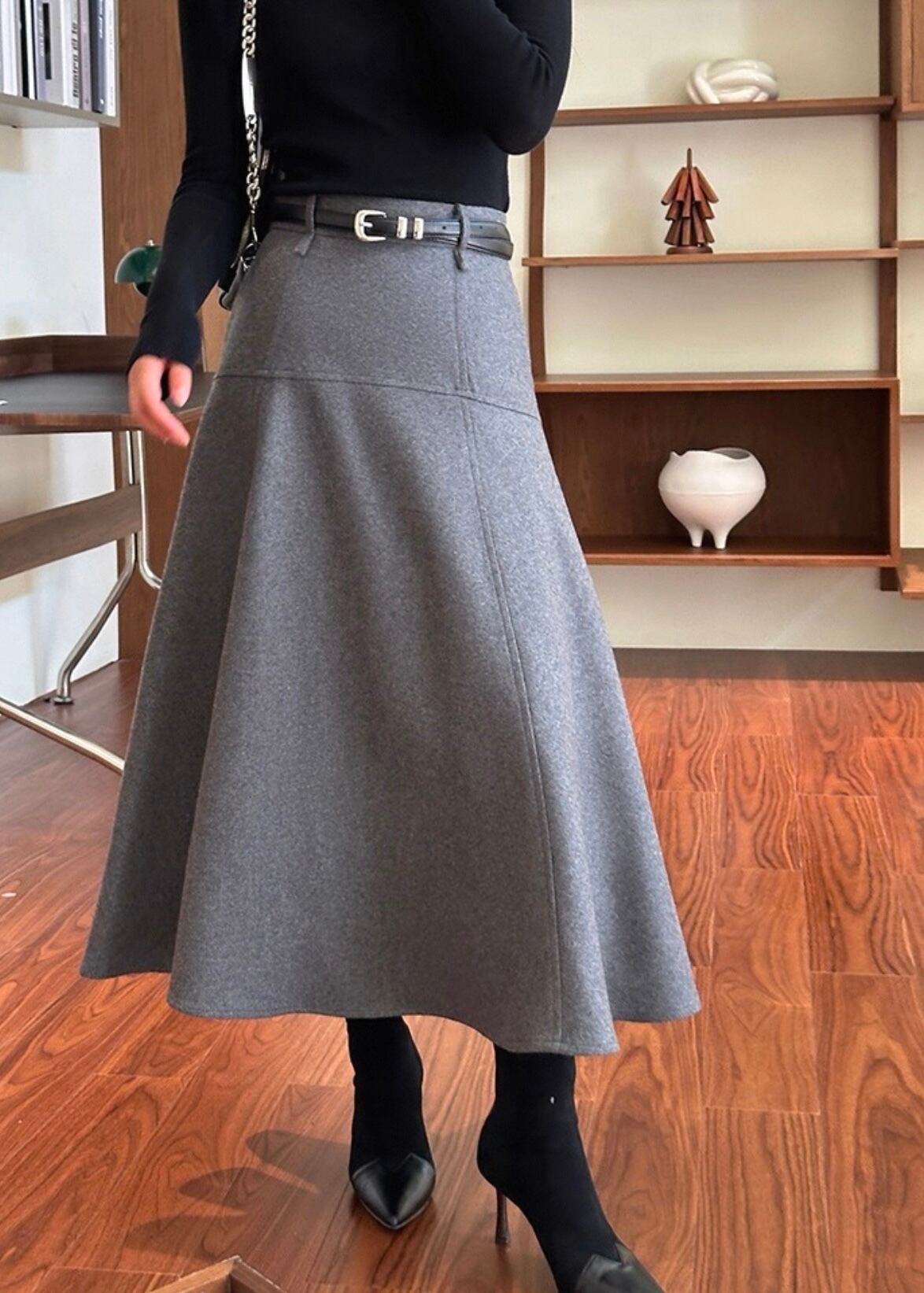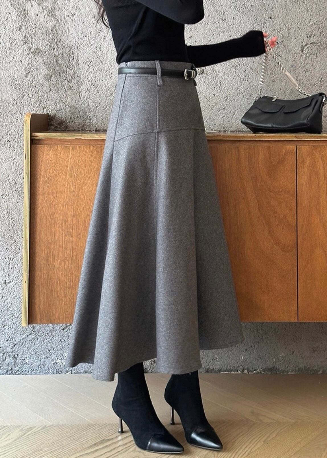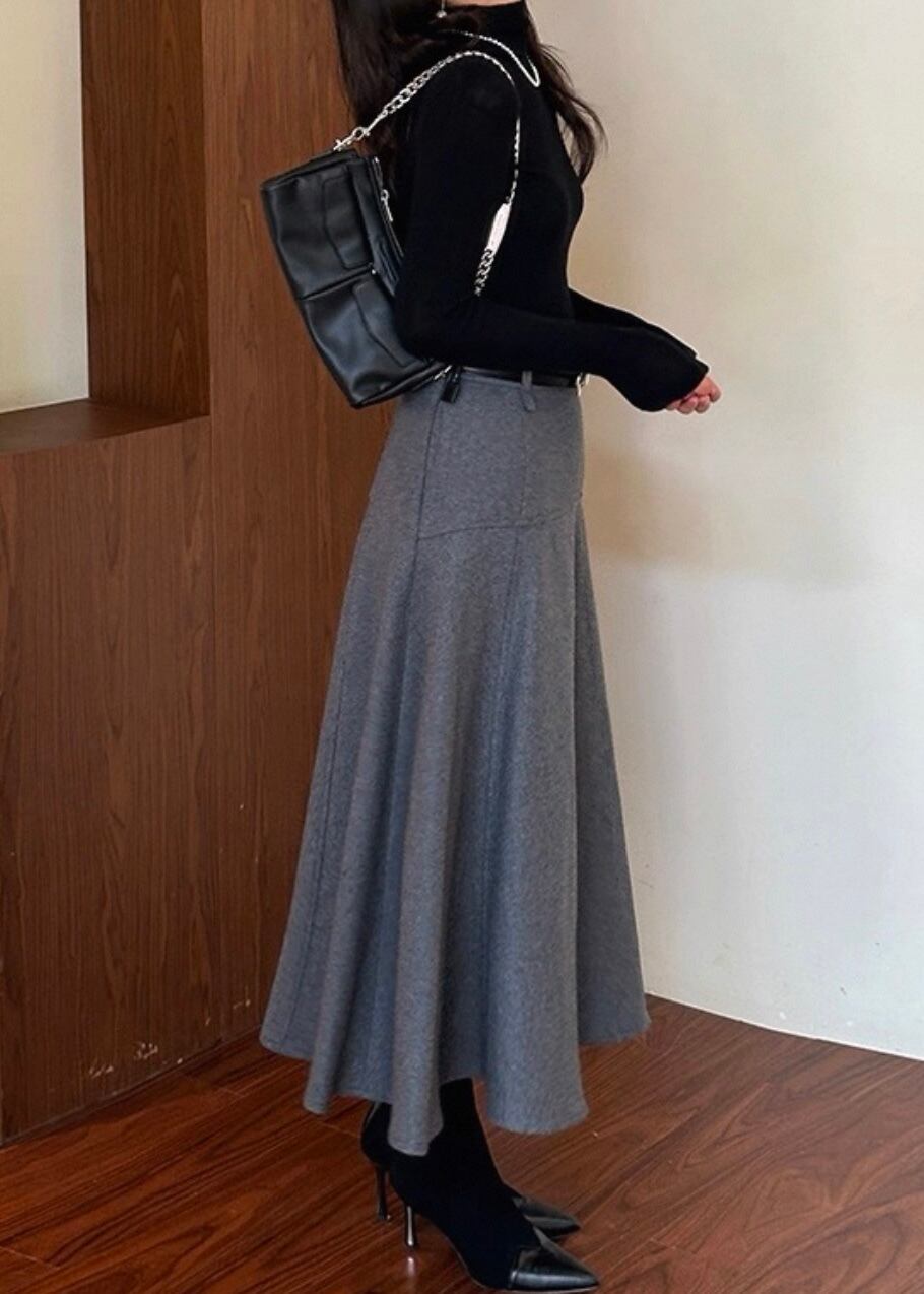 ベルト付きAラインミモレ丈スカートは、上品で洗練された印象を与えるアイテムです。