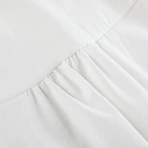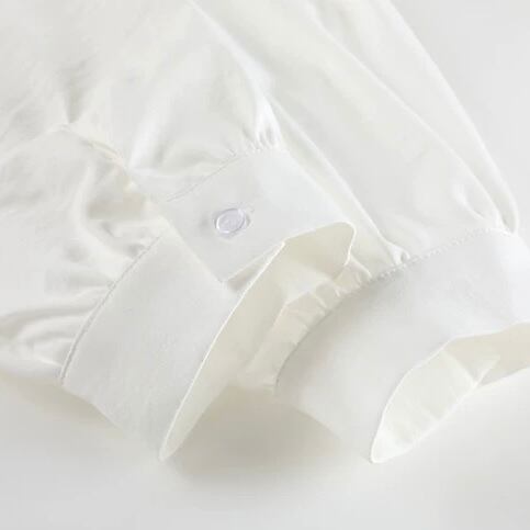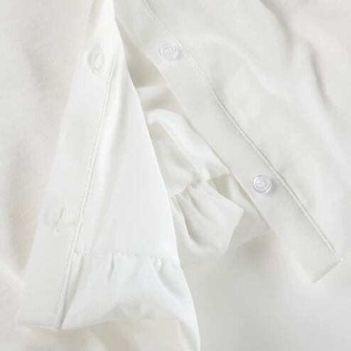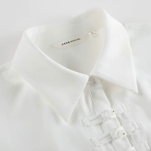 すっきりとしたシャツカラーと、チャイナボタンの組み合わせが、洗練された印象を与えます。