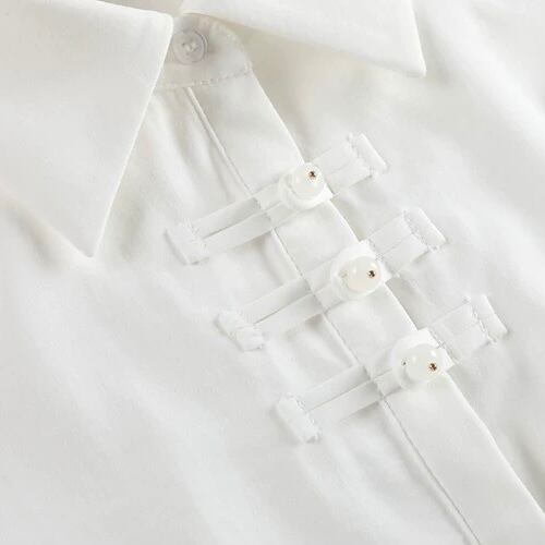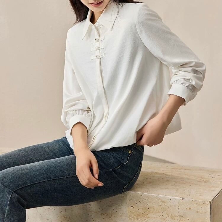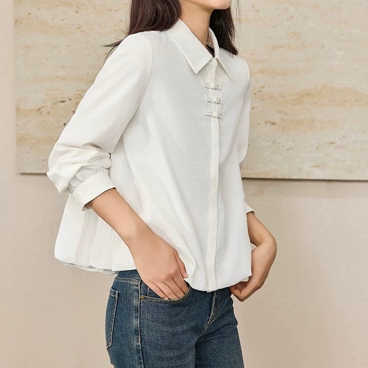 チャイナボタンが印象的な長袖シャツカラーブラウス。