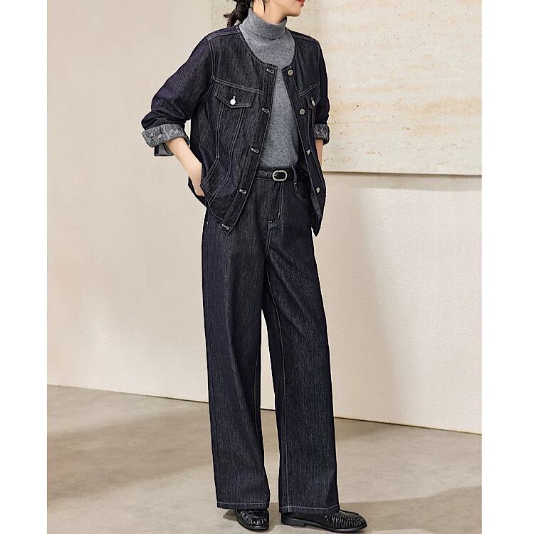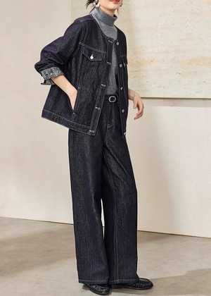 上品なデニム風の質感が魅力のセットアップ。