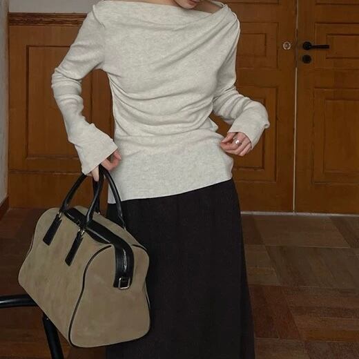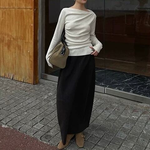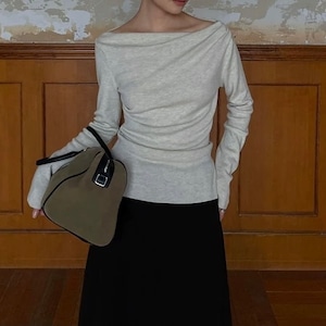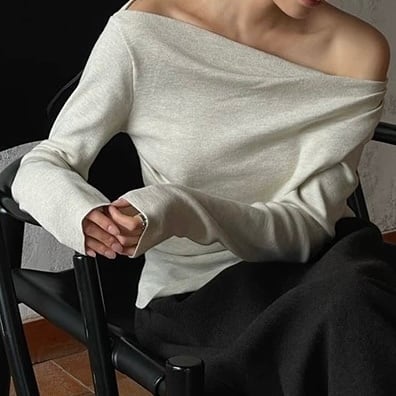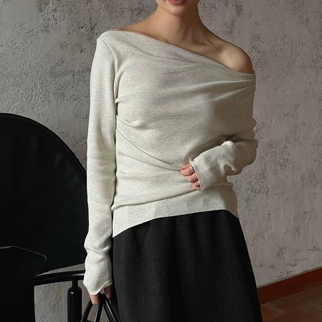 肩のラインを華奢に見せるドロップショルダーの長袖トップスです。