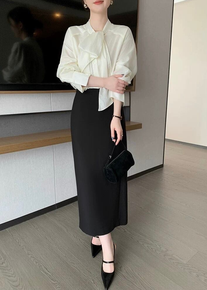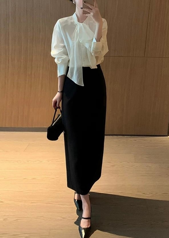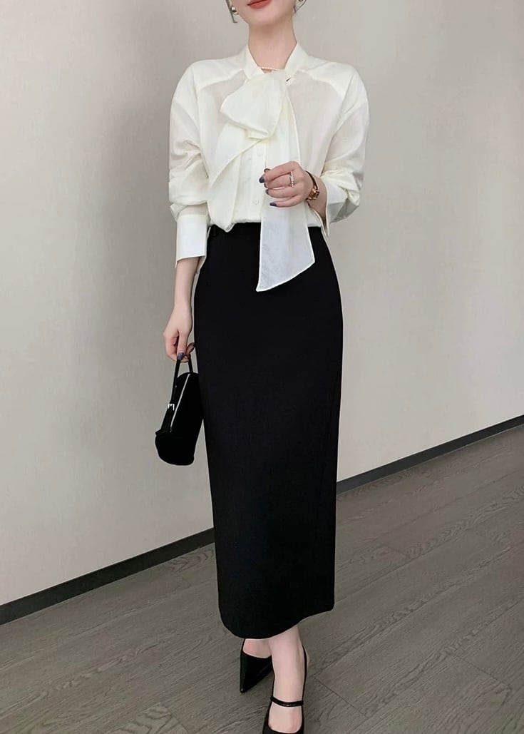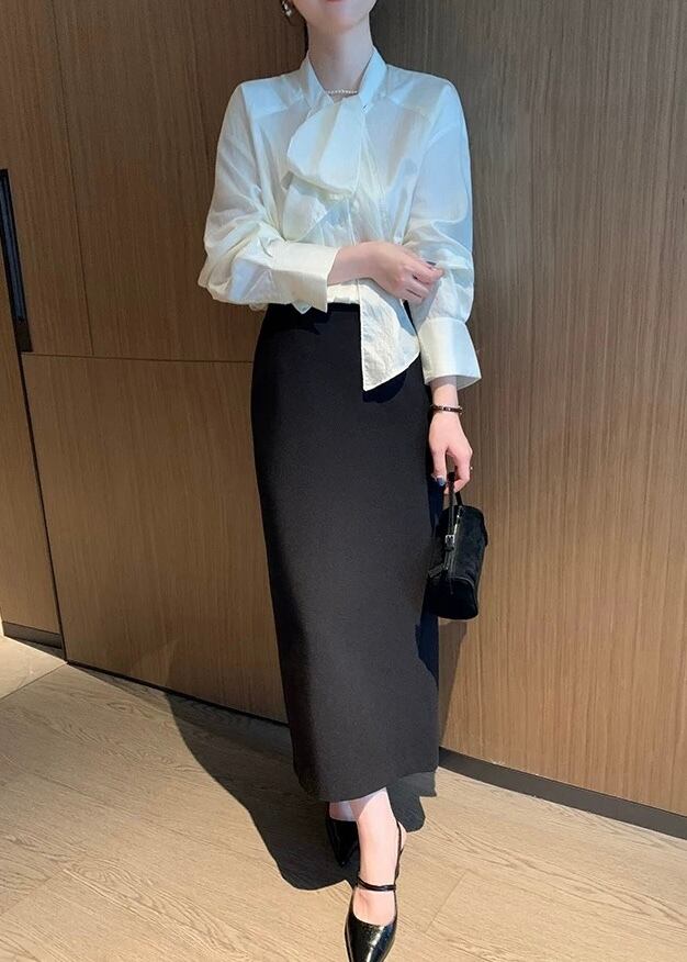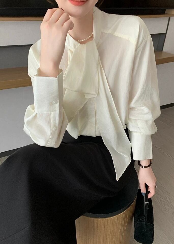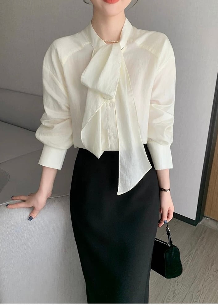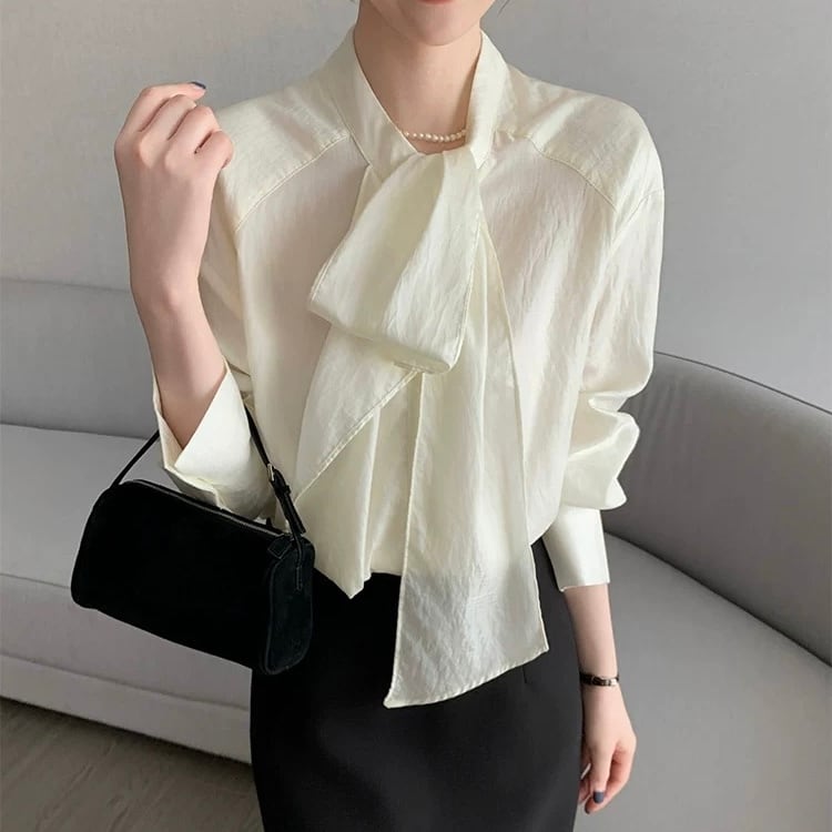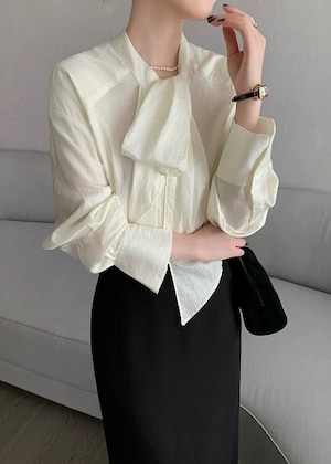 一枚で着映えするボウタイ長袖ブラウス。