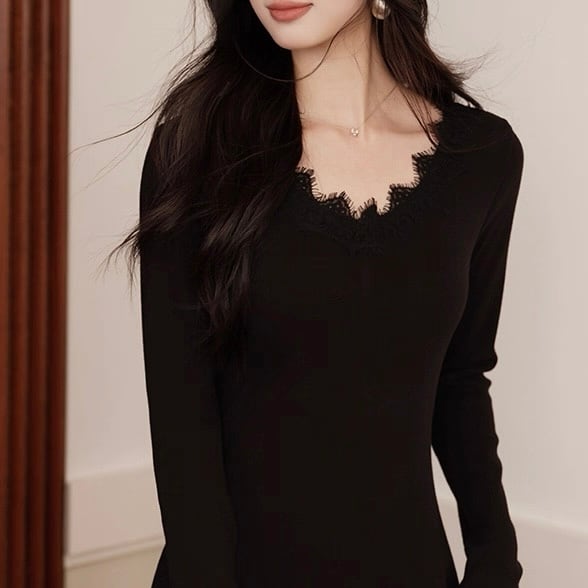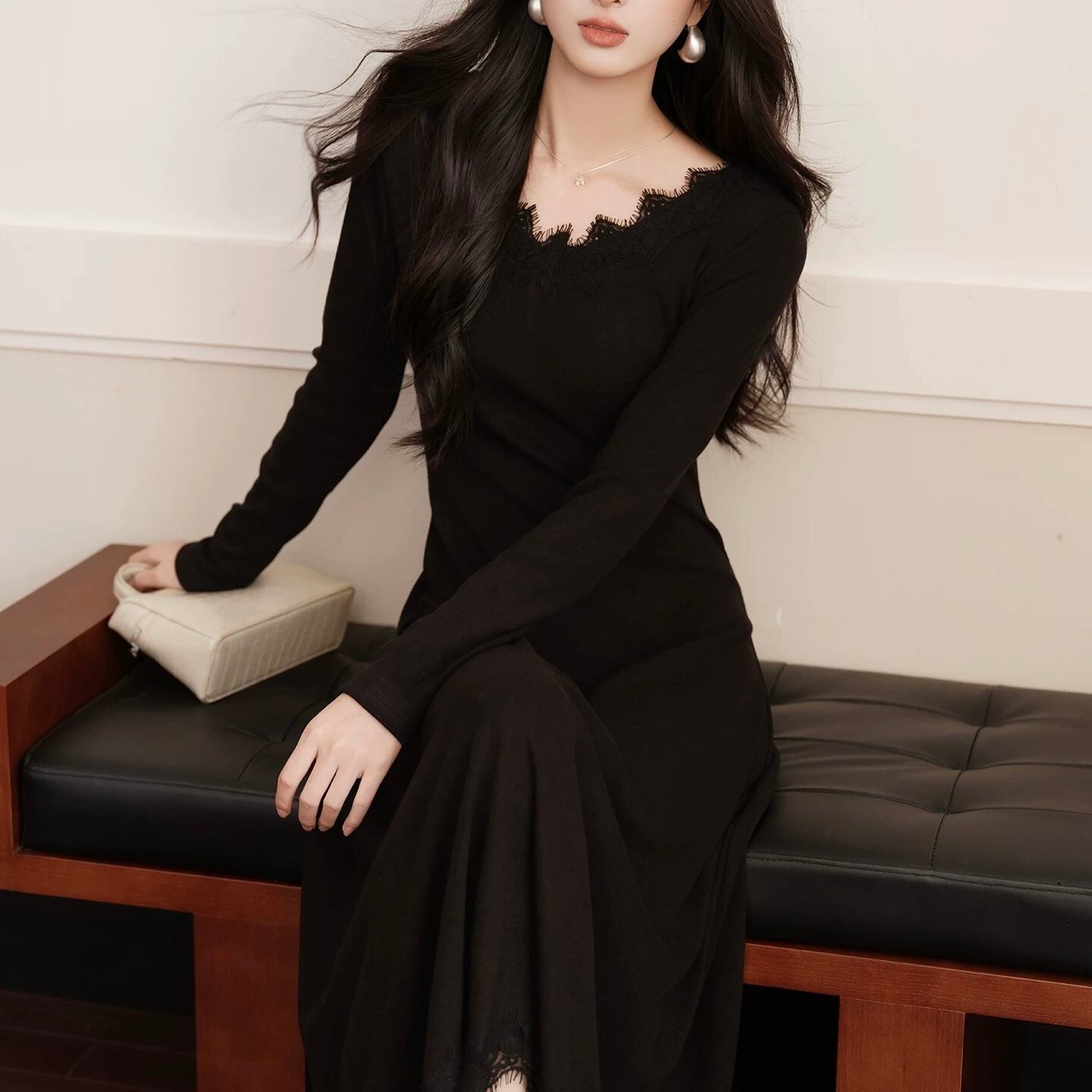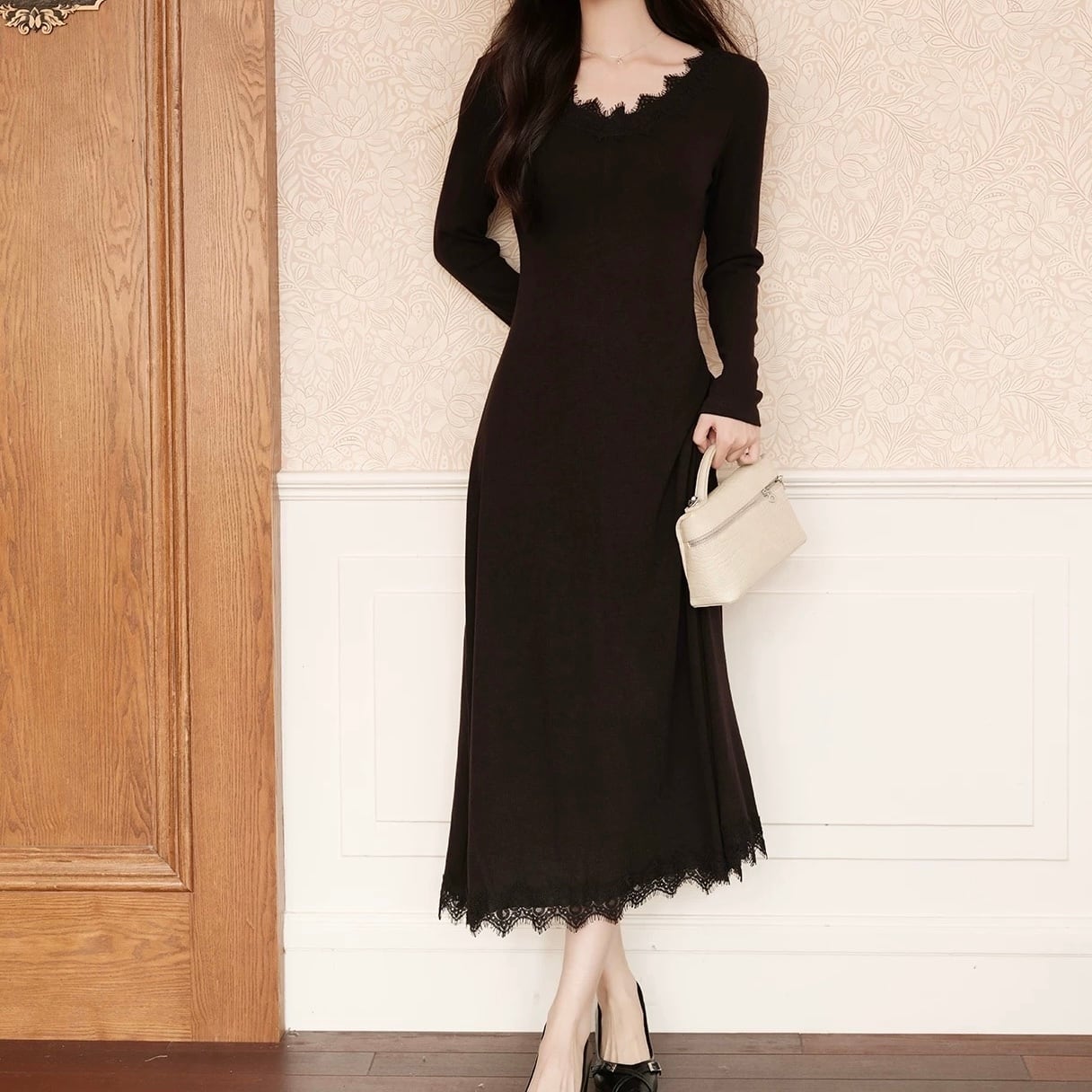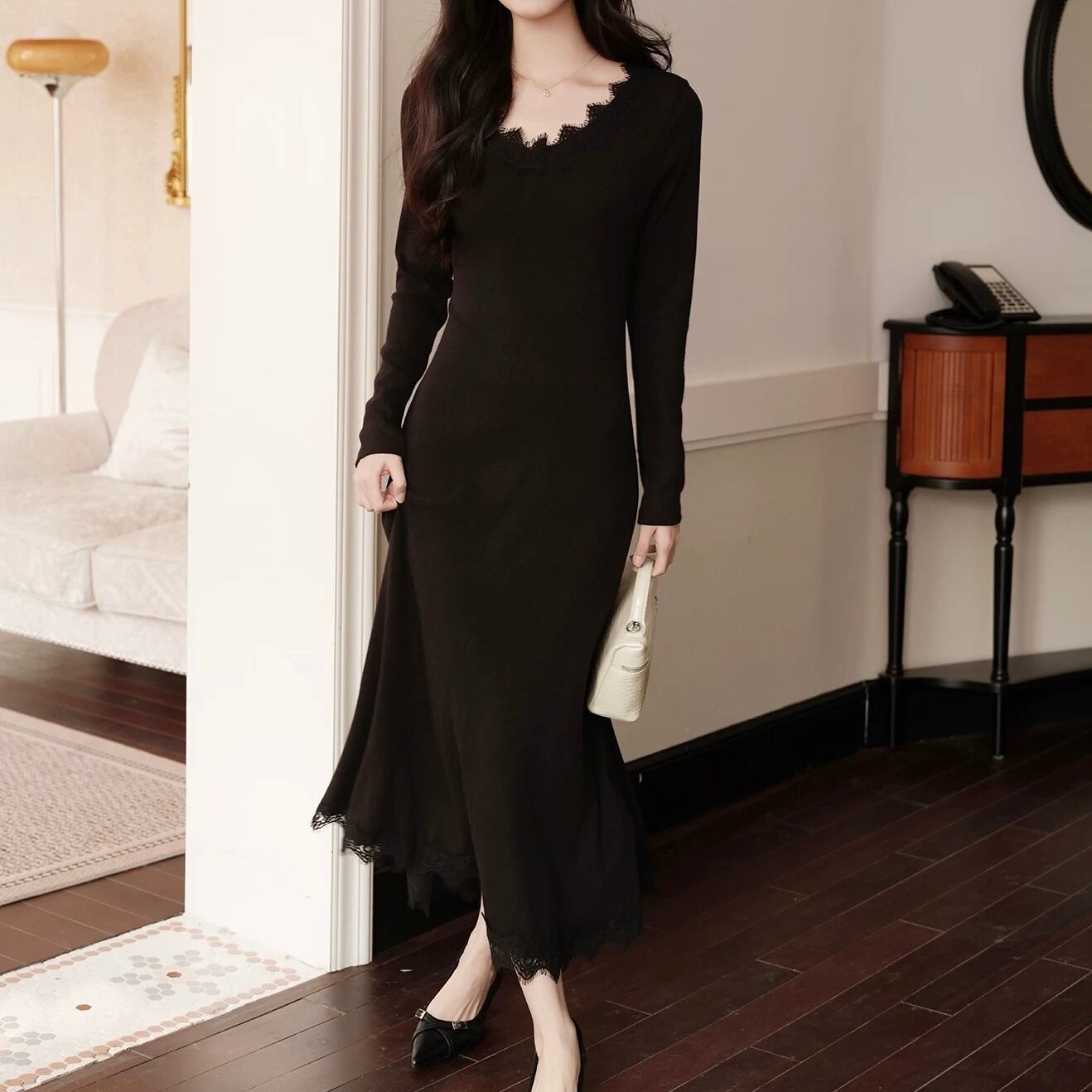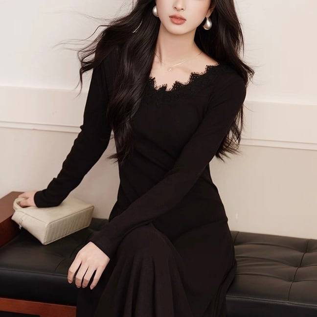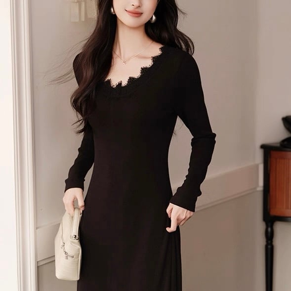 レーストリム 長袖 ミモレ丈 ワンピース YH10009
