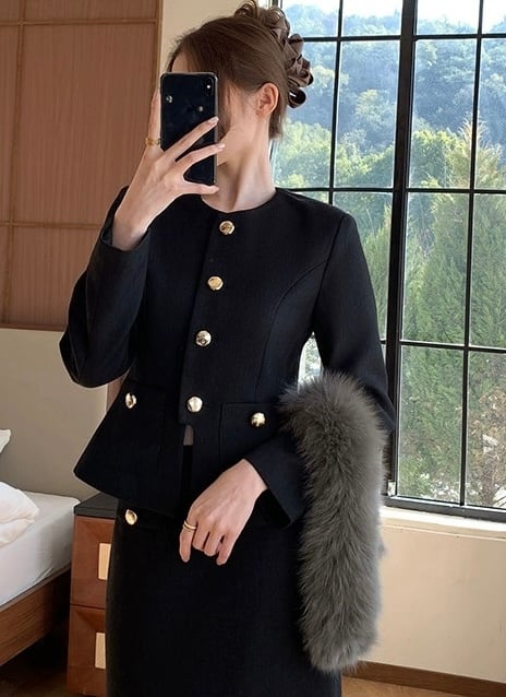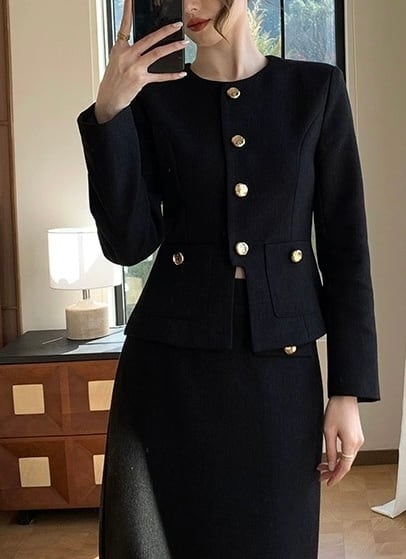 ボタンフロントのデザインが洗練された雰囲気を演出し、オフィスシーンにもおすすめです。