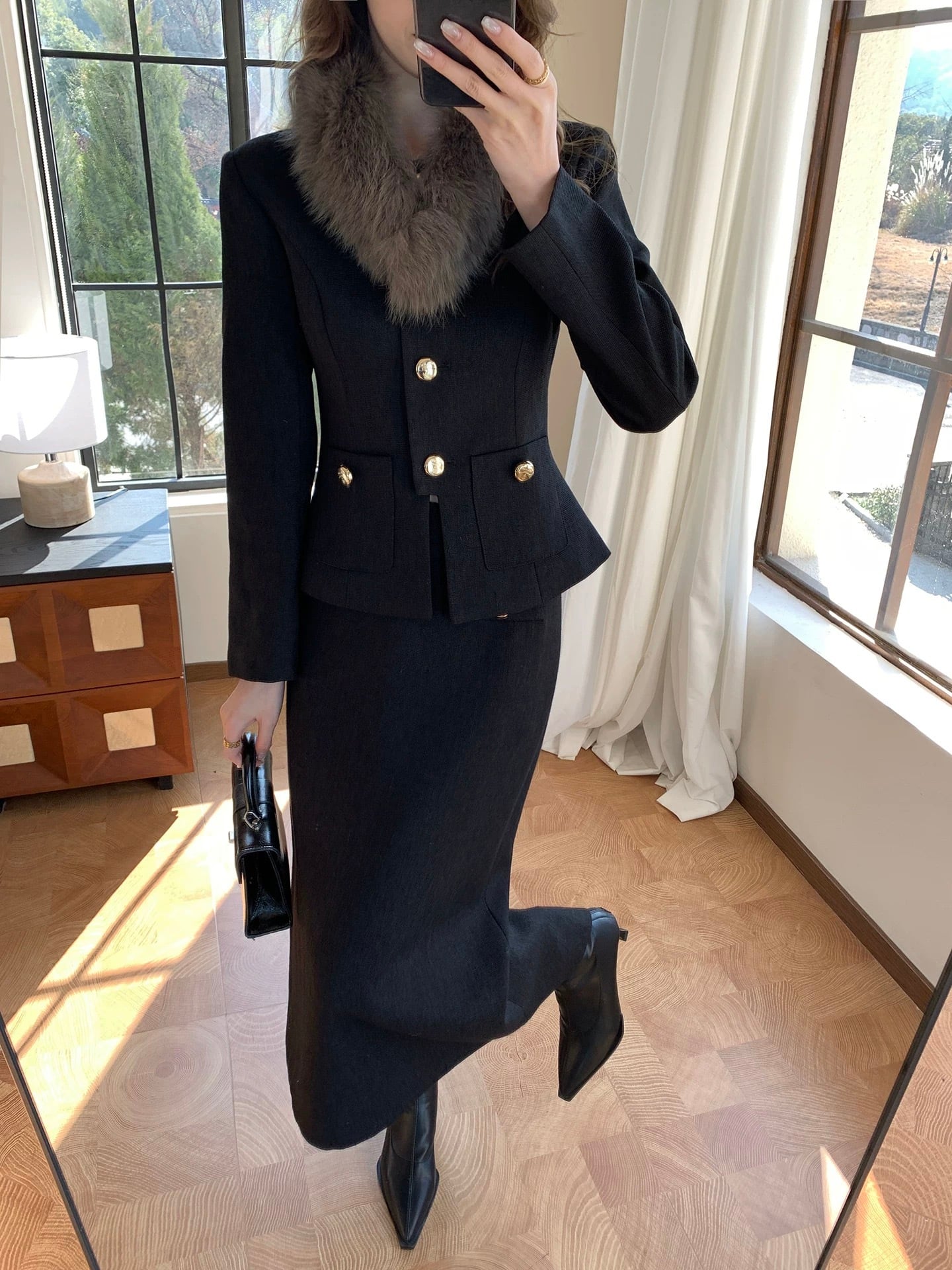 上品な印象を与えるミドル丈ペプラムジャケット。
