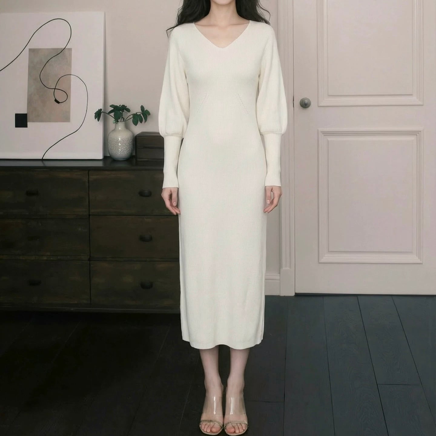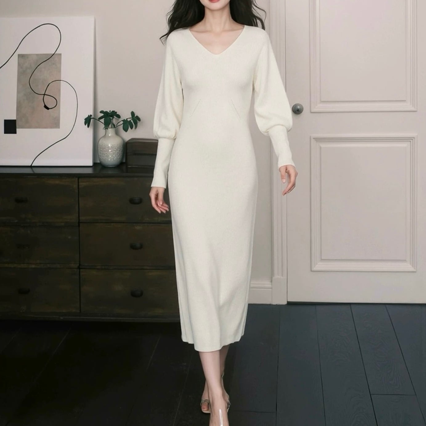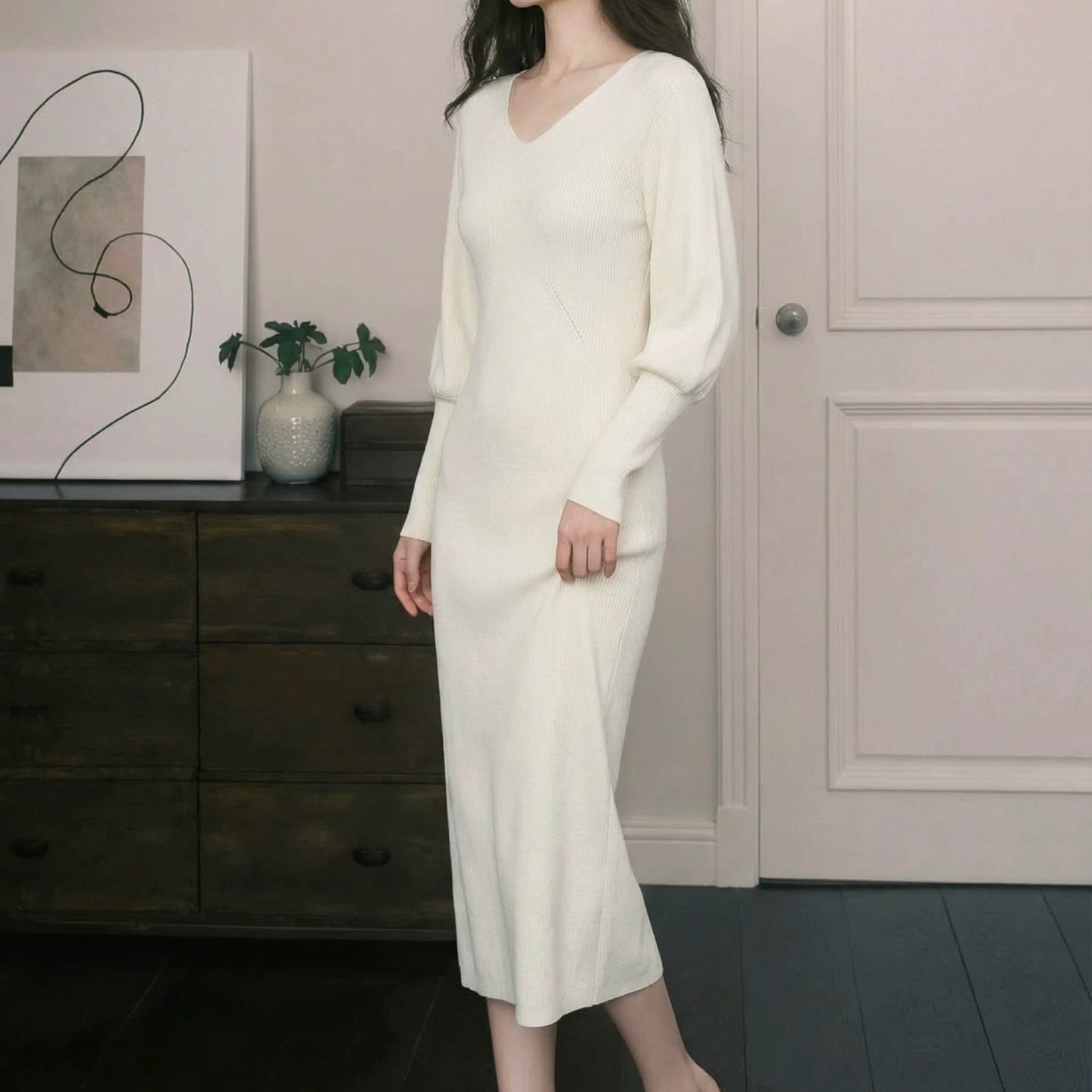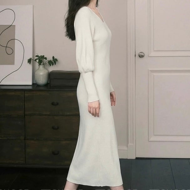 Vネックがデコルテを美しく見せてくれる、長袖ニットワンピース。