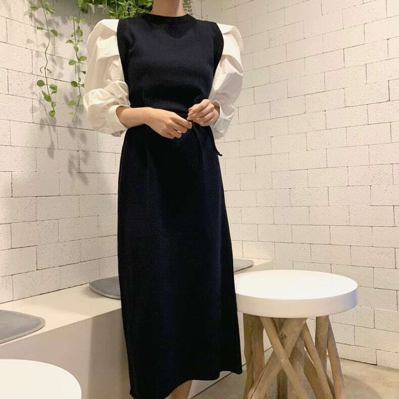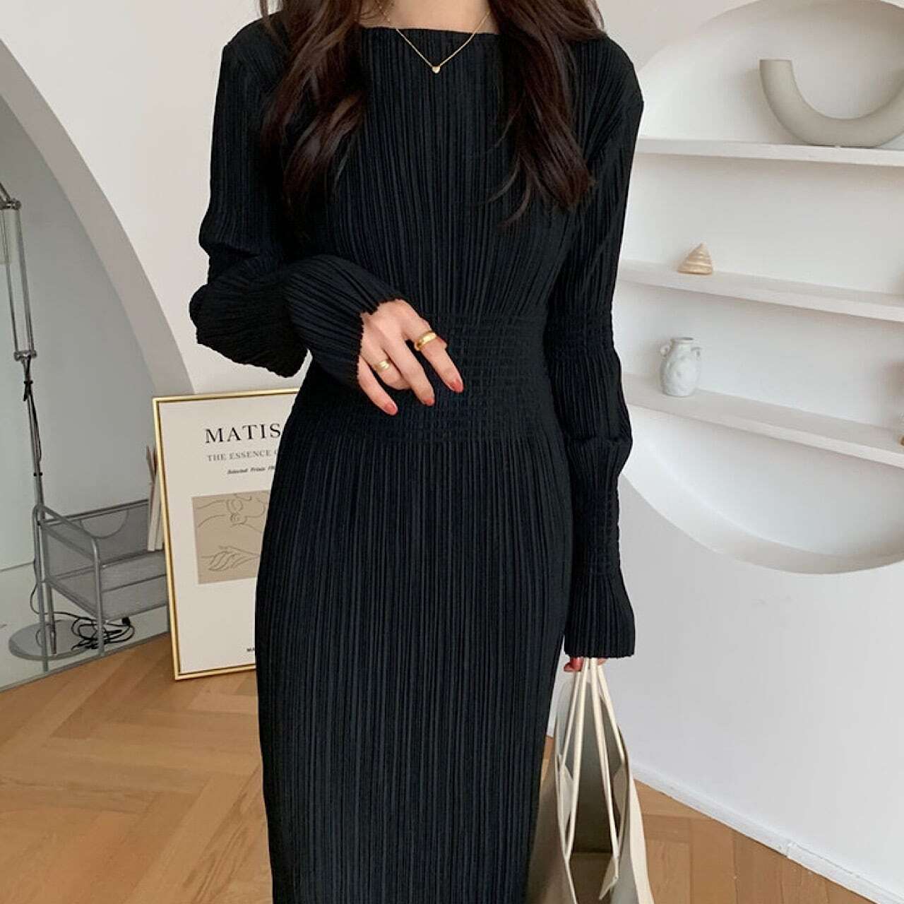 シンプル ラウンドネック プリーツロングワンピース YH8233