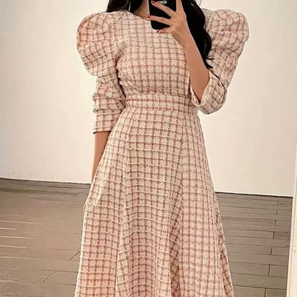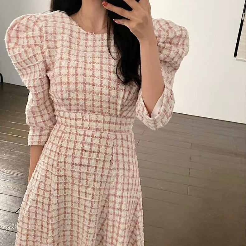 甘いラウンド ネック ツイード ドレス ◆2col YH8443