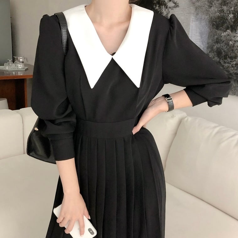痩身ウエスト プリーツドレス リトルブラックワンピース YH8669