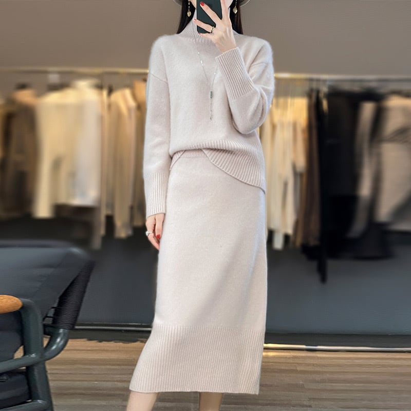 秋冬のコーデに最適なプルオーバーとスカートのセットアップで、