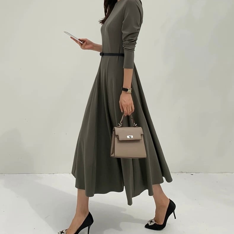 クルーネック ハイウエスト Aライン ミディ丈フレアスカート YH8804