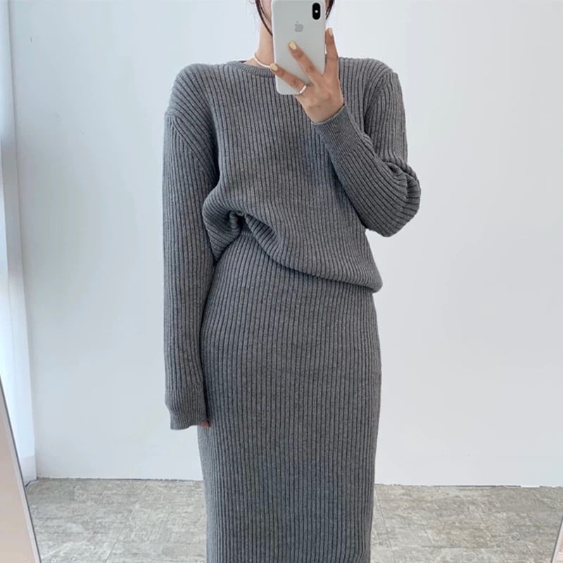 韓国風 ラウンドネック長袖ニット+ハイウエストタイトスカート◆3col YH8820