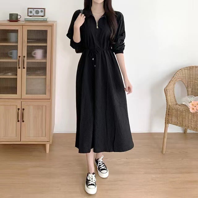 フレンチシンプル ウエストリボン付き 七分袖ロングワンピース YH8823